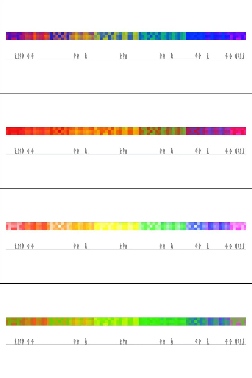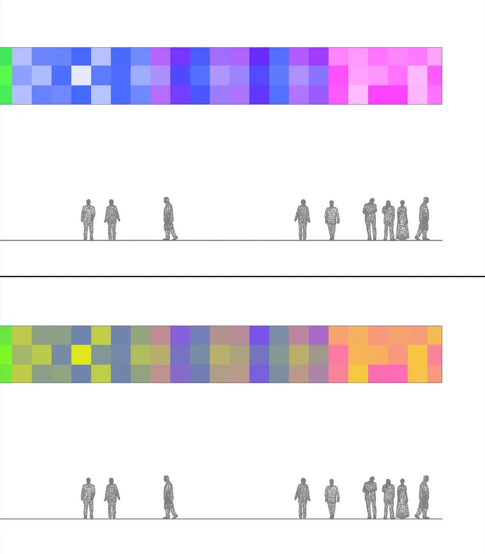 它是对线性时钟的艺术诠释,遵循视觉逻辑将色彩光谱解释为一个小时的时间周期。在每一个小时的循环中,颜色的拼凑慢慢地随着“时间&颜色”在每一个时刻的主导作用而变化。这些颜色看起来大多是静态的,每分钟有一个小的视觉变化,每十分钟有一个稍微大点的视觉变化,而一个主要事件变化标志着一个小时。装置艺术作品同时对上下两个方向的观众可见:下面大厅中的旅行者将其视为大型展示,而上面到达大厅中的旅行者则与之并肩而过,并穿过沉浸式的彩色灯光走廊。