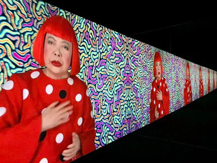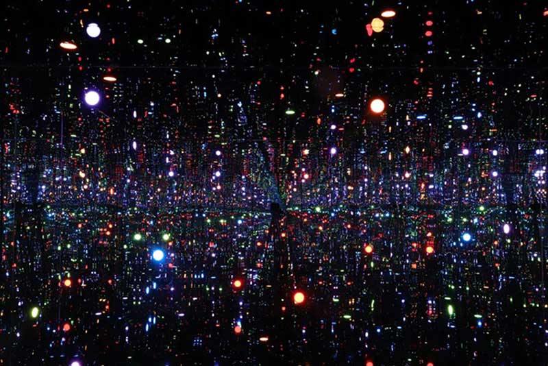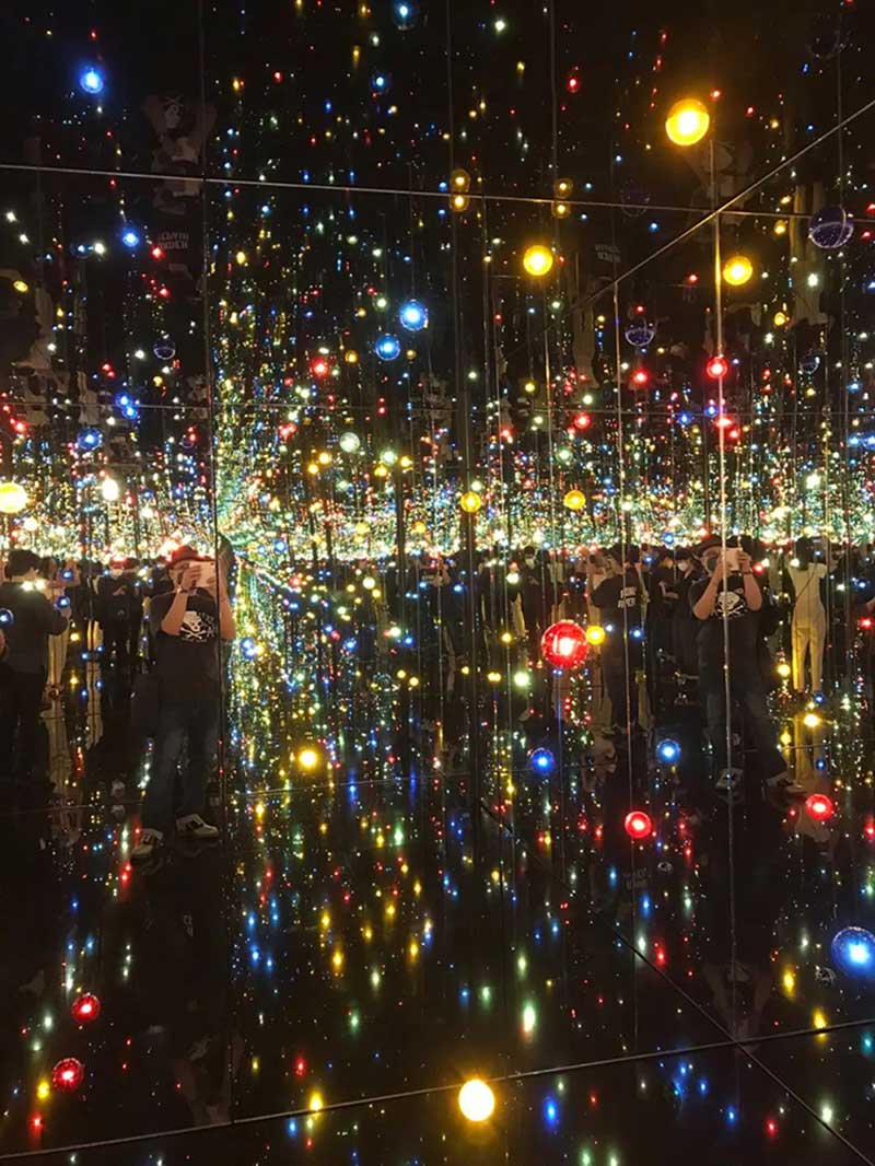 另外一个草间弥生创建的装置艺术作品《无限之镜之间-从宇宙的彼方召唤来的人类的幸福的愿望》,绘画的则是草间弥生对宇宙和未知世界的渴望,跑进镜室,仿佛置身于无限宇宙的星尘之中,转让人忘记了恐惧,只剩下眼睛不给的幻影。