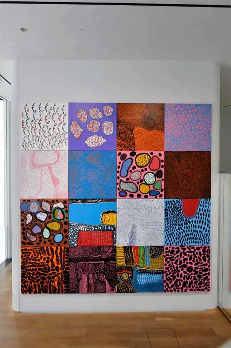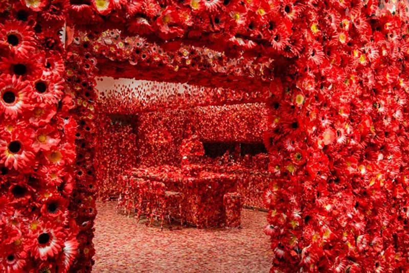 其中,在从2009年起便开始的《わが永远の魂》系列画作中,草间弥生将他内心世界的幻象,一一倾泻而出,化成一幅幅一平方公尺大小的大型画作,整齐陈列着,与大家分享他过往心理活动的起伏、变化。而在他最新的装置艺术作品《フラワー・オブセッション(FLOWEROBSESSION)》中,他将覆盖了整个房间的圆点,换成鲜艳色彩的花朵,从地板到天花板全都是他对花朵的迷恋与痴迷,让人分不清楚,现在究竟是身处于花海之中,还是另一个幻象世界。