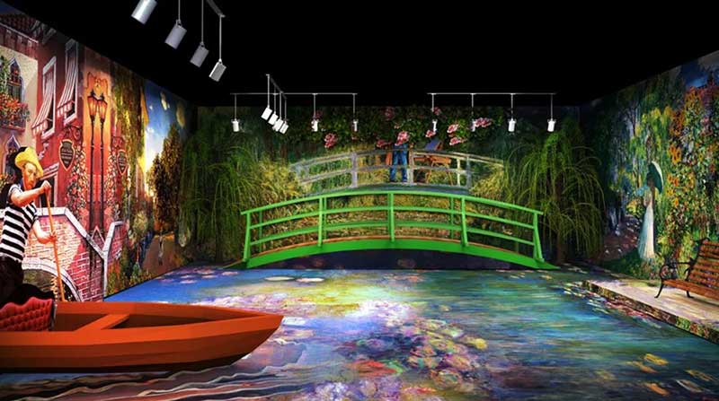 这次展览还原了19世纪印象派名画中的场景,用沉浸式立体方式,配上光绘体感交互技术、AI智能语音及全息投影等技术,搭建了一个沉浸式的实景,高度还原印象派名画中的经典场景与人物,仿佛穿越到了19世纪名画中的浪漫法国,身临其境,处在浪漫主义包围的艺术环境中。