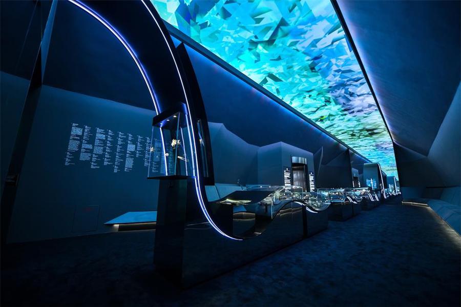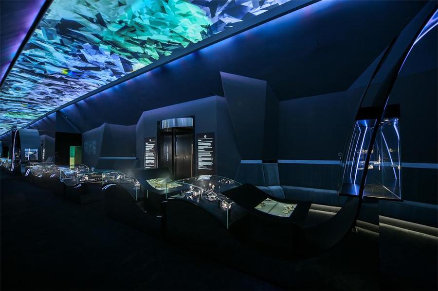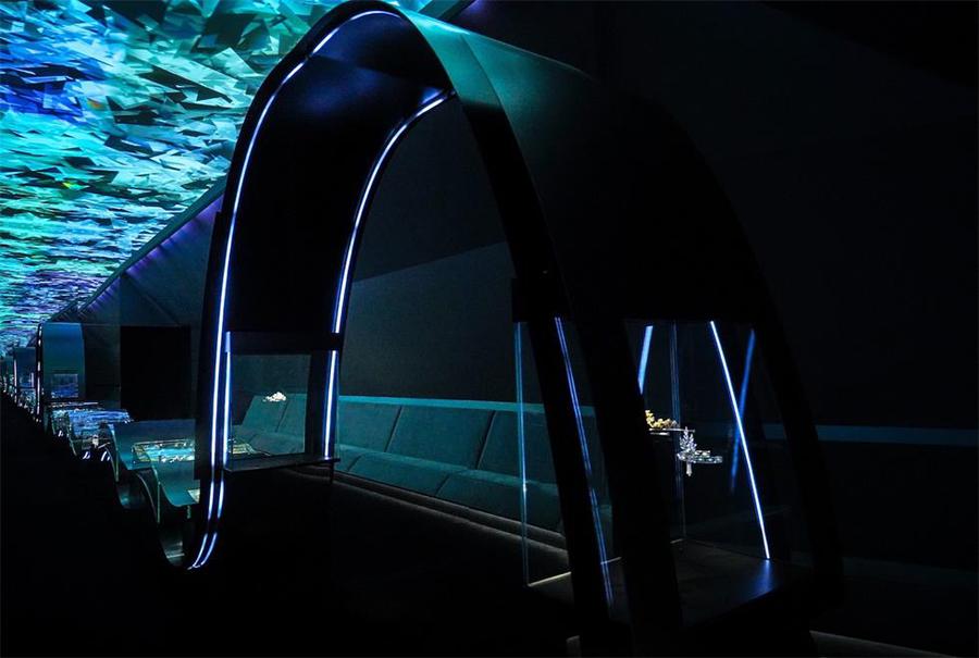 展览的开篇是“蒂芙尼蓝厅”,它以一种有趣的方式来讲述这种品牌标志性色彩的故事,也是蒂芙尼品牌最重要的视觉元素之一。即使房间只使用一种颜色,但仍然使用现代的显示器展示许多不同的宝石,包括海蓝宝石,坦桑石,蓝色电气石,蒙大拿州蓝宝石,蓝色钻石和月长石。