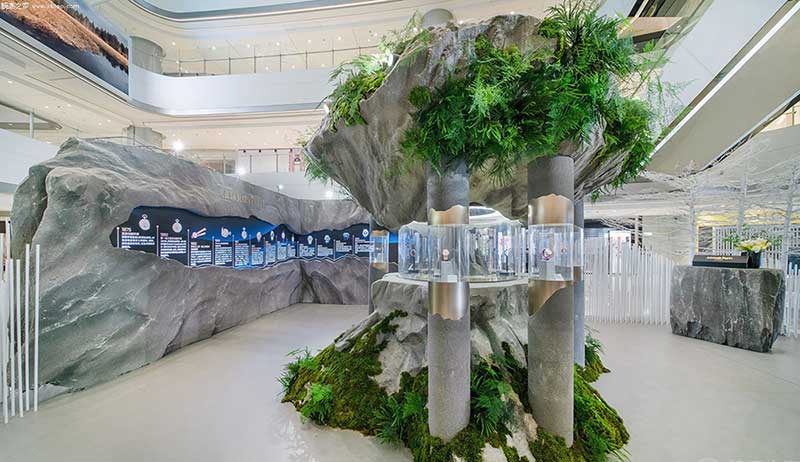 成都IFS精品店的设计灵感源于品牌发源地汝山谷布拉苏丝的云雾、冰雪、松林与山峰层错交叠的美景,整体风格兼具自然与现代简约之美,以现代的视觉手法将自然风貌与都市糅合,体现品牌蓬勃向上的生命力。展厅中央是撷取自瑞士汝山谷的巨大岩石,臻品时计就藏匿其中。