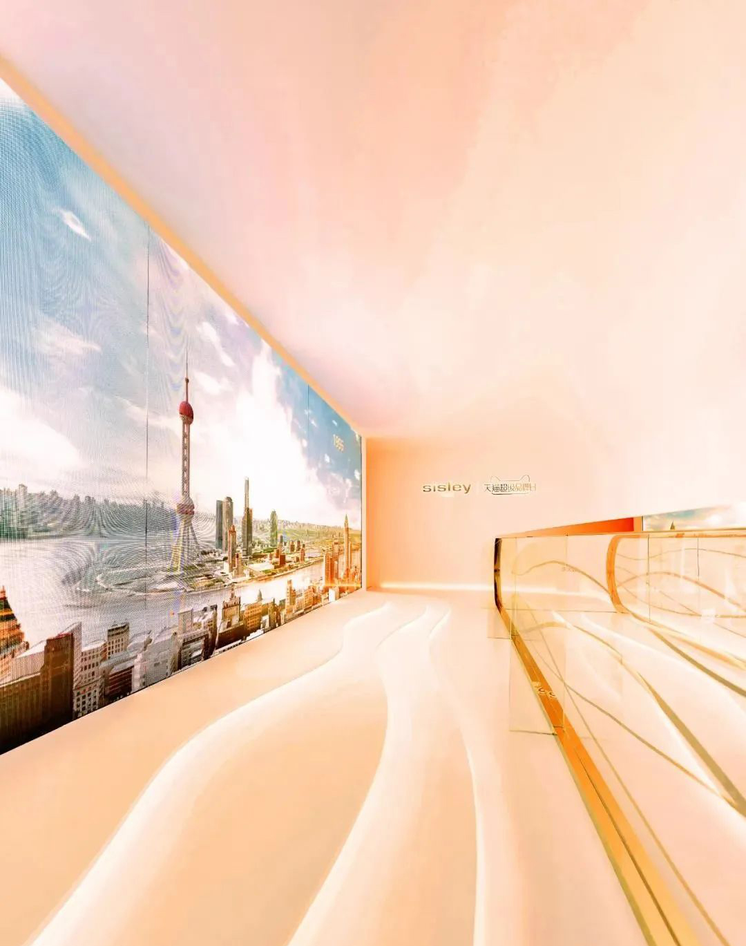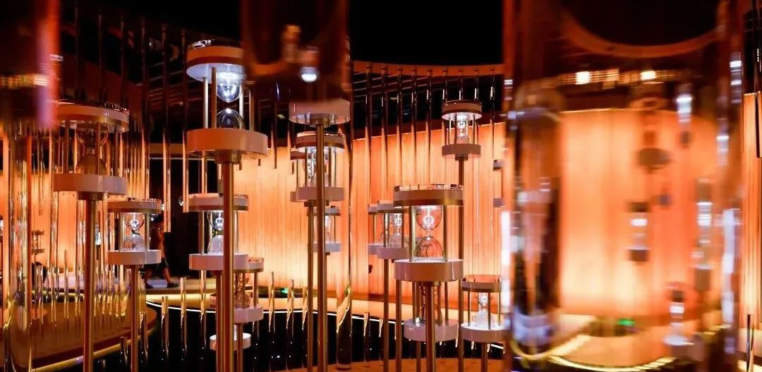 L1时光回溯区:在时光流转中,有抗皱修活系列产品的加持,可逆转时光回溯青春。设计灵感源自Sisley法国希思黎抗皱修活系列瓶身,以晶莹剔透的白玉色打底,中部嵌入鎏金。波浪状的镂空造型犹如绵延流转的时光,核心区域错落有致地陈列着“放大版”的产品瓶身,嵌以20个倒流的时光沙漏。