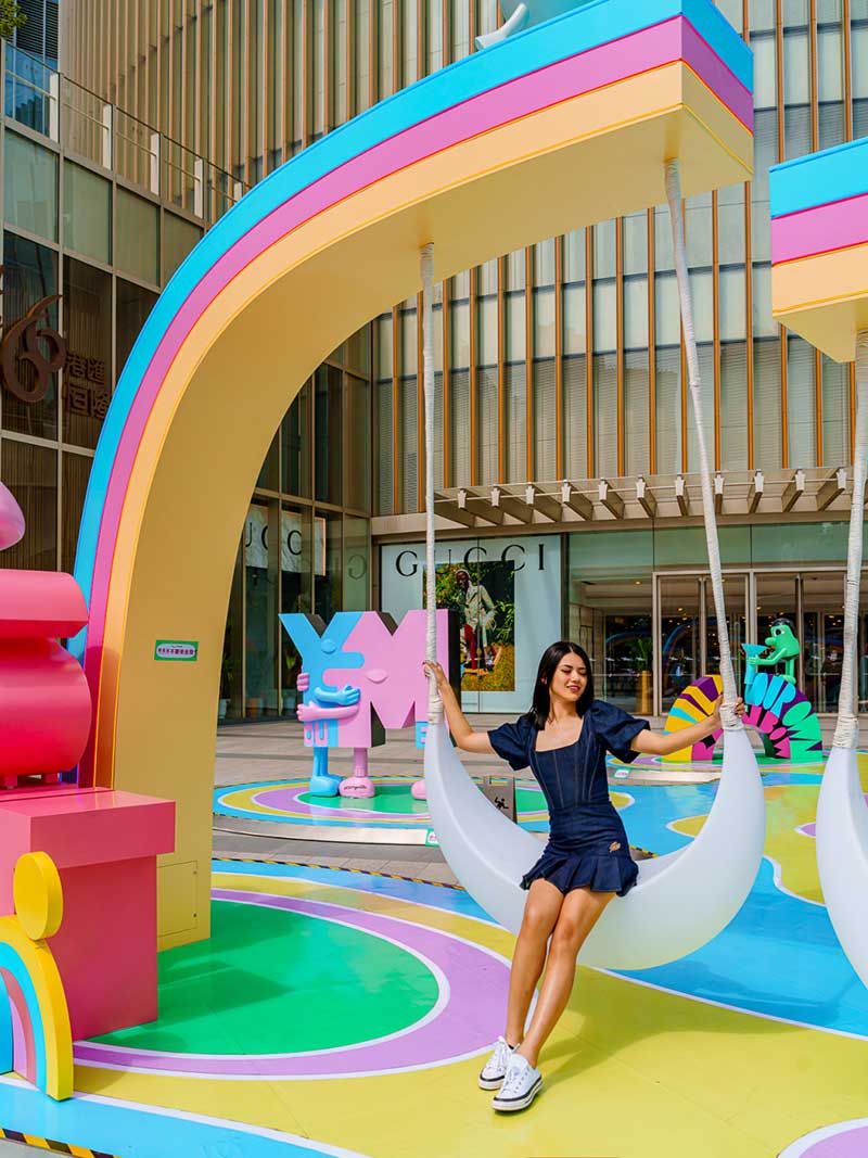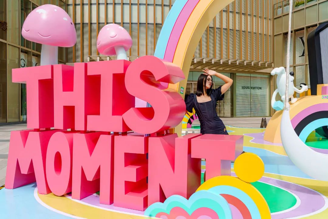 本次Jeremyville以“Enjoy Life Enjoy Love”为主题,希望能为大家传递爱的力量。不同的装置围绕这个主题,矗立在港汇恒隆正门,远远望去就让人忍不住一探究竟。整个装置最吸引人的,就要属这个由彩虹桥和月亮秋千组成的互动区域了。意欲着希望的彩虹搭载着新月,忍不住坐上秋千,感受孩童般的无忧快乐,心情瞬间大好,让人感叹快乐就是可以如此简单!在一旁的“THIS MOMENT”区,两颗可爱的蘑菇头相互依偎在一起,则要提醒大家适时的放下工作和烦恼,享受当下的美好。还有可以找回童年回忆的跷跷板,正在搭建“专属彩虹”的卡通小人儿,都在时刻提醒大家去发现生活中真实的小确幸哦。