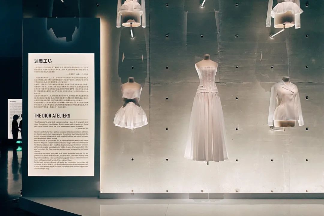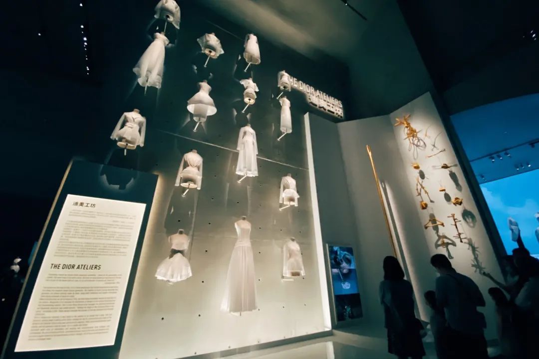 迪奥工坊是品牌的核心,包含着一件服装从草图到成衣的全部制造过程,整个墙面的样衣极具视觉冲击力,右侧是艺术家刘建华和林天苗各自的作品《延伸的空间形式》和《步骤》。