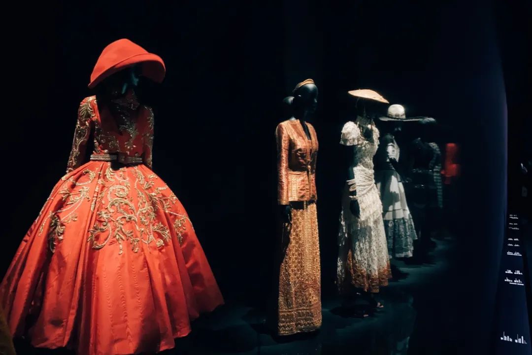 顾名思义,该区域展示的是宫廷风格礼服,从场景到灯光布置都与之前几个区域有所不同,C位作品来自John Galliano设计的1998春季高级订制服。