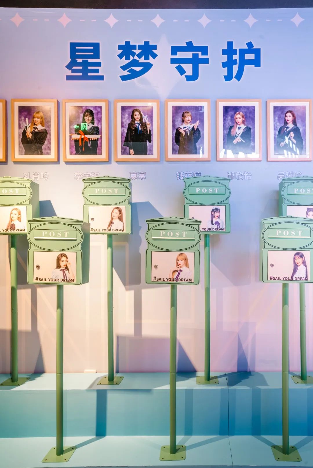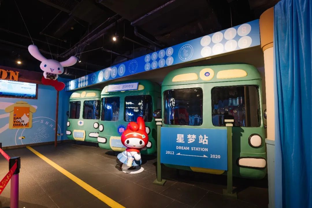穿过行李箱造型的时空门,列车从2012年缓缓驶来,三辆绿皮火车成功停靠在星梦站,不仅是致敬12位成员8年来的坚持与付出,更是对她们未来征途的祝福。展厅中央的梦幻旋转木马,成功俘获了一大批萌妹子的少女心,珍珠贝壳、Hello Kitty沙发上摆放的都是成员公演时穿过的服装,快坐上木马get甜美靓照。