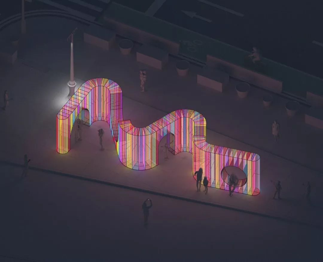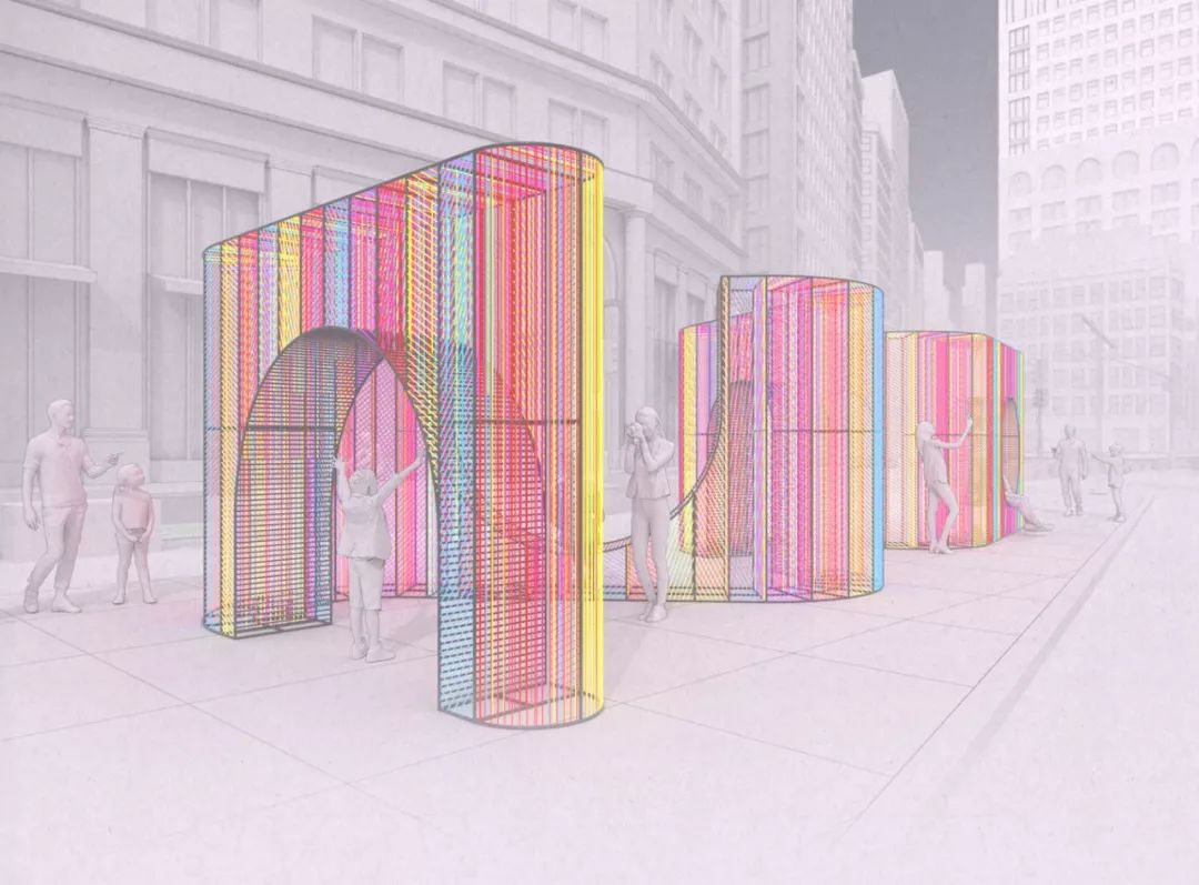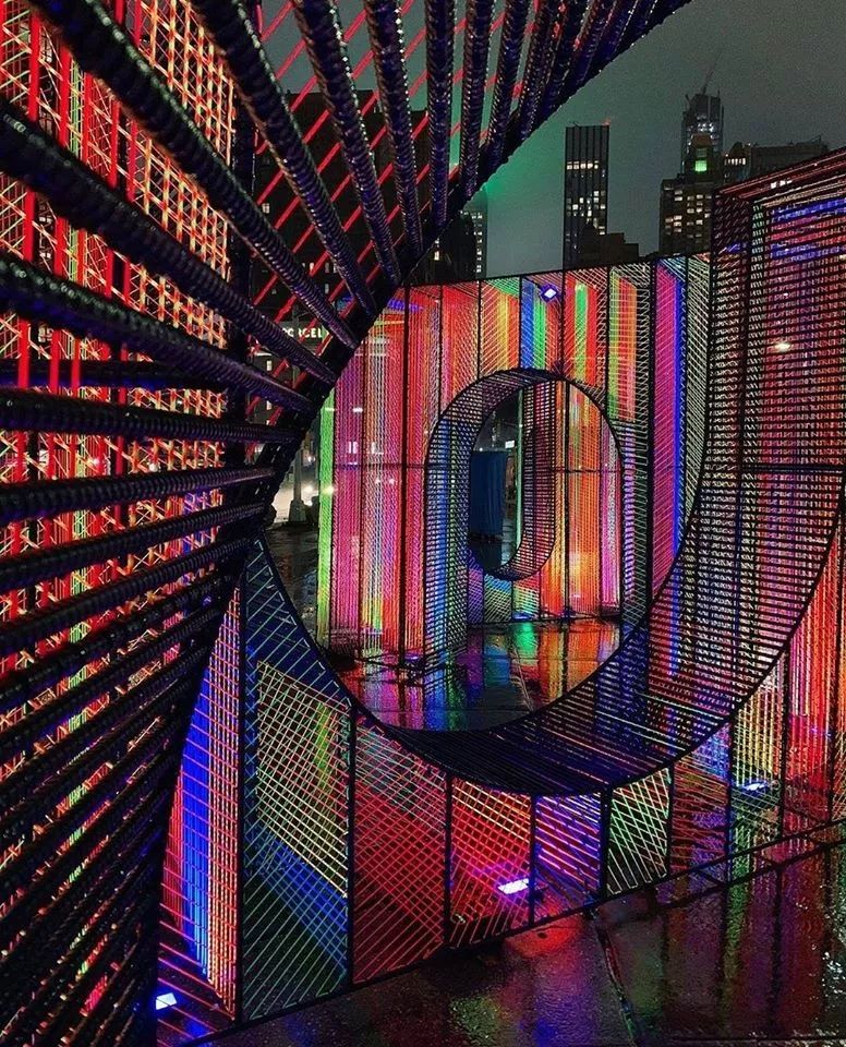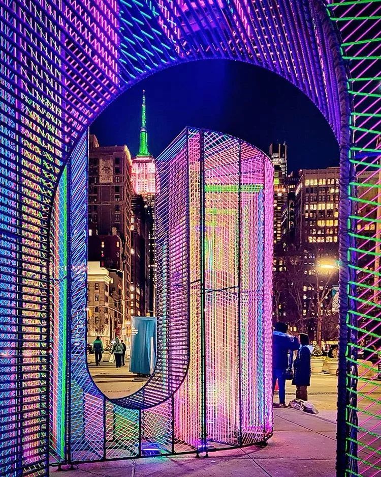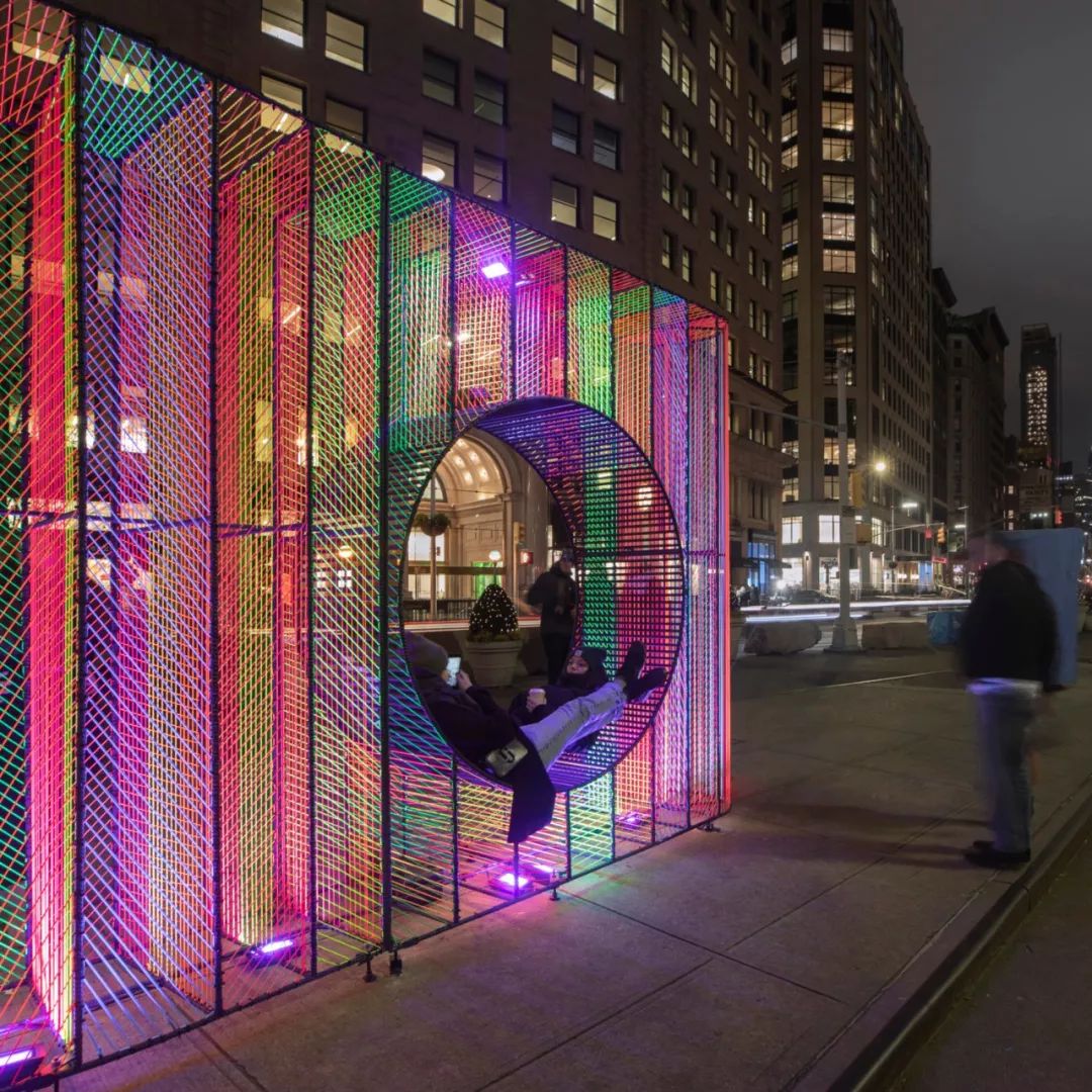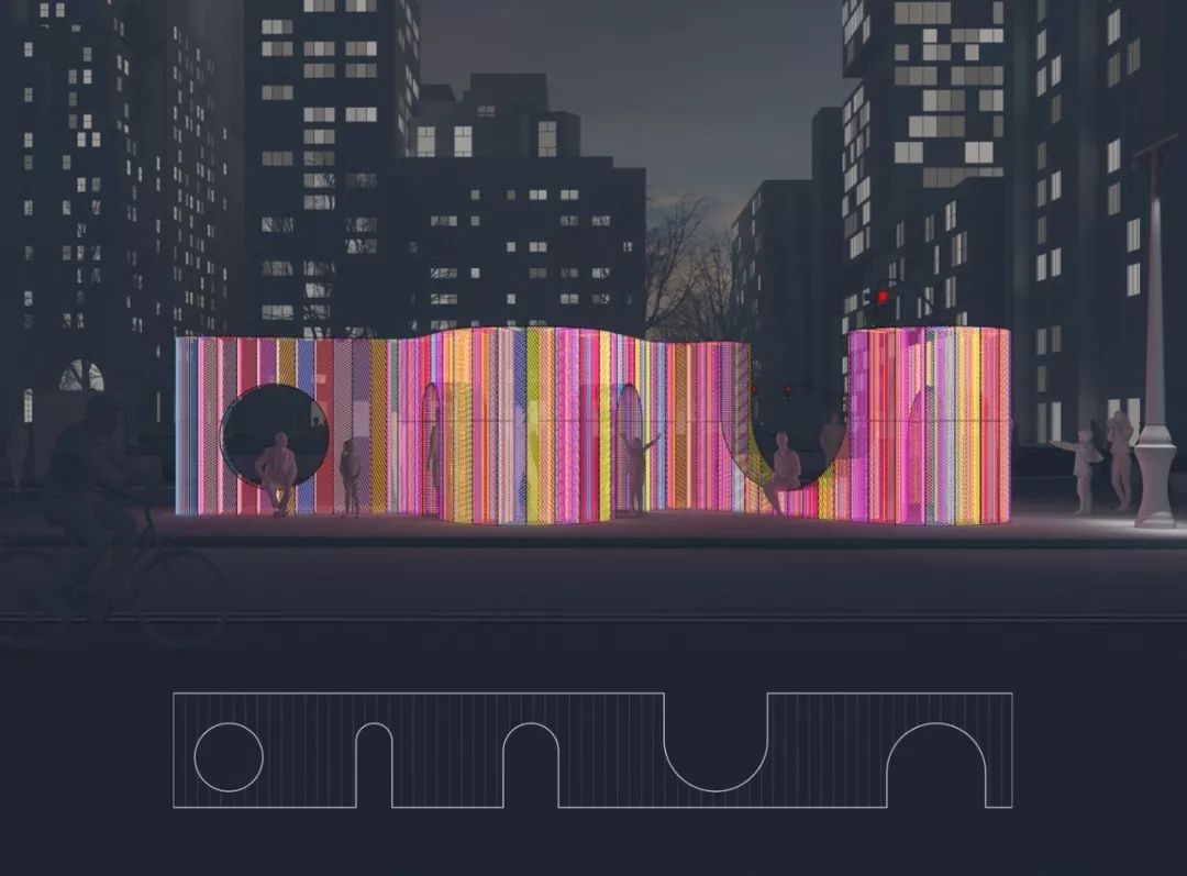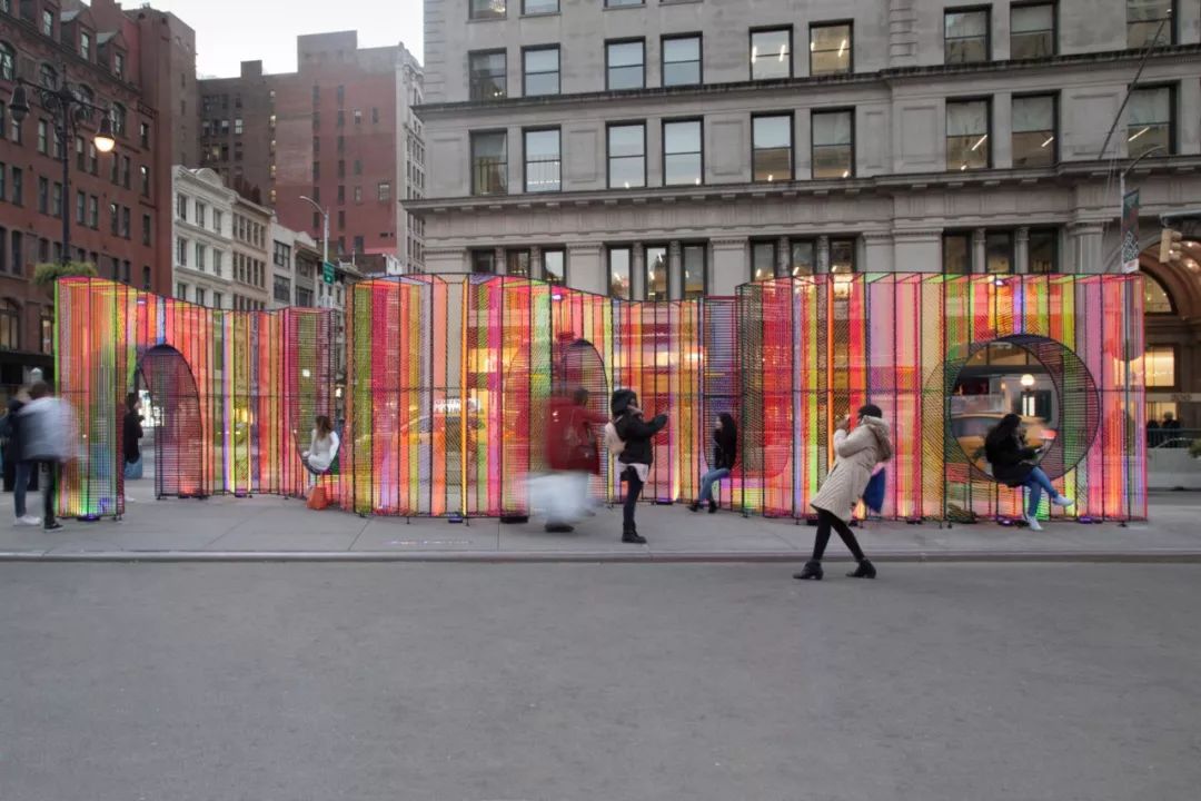中建筑工作室hou de sousa的Ziggy是一件弯曲的彩虹灯光装置,展位于Broadway,Fifth Ave和23rd St之间,以鲜艳的色调和俏皮的手法庆祝节日。Hou de Sousa的设计建在Flatiron的三角形的地块上,将自己置于狭窄的场地限制内,并采用了与周围建筑相呼应的尺寸。黑色钢筋包裹在27,000英尺(8229.6米)的绳子中,形成彩色的幻觉,并通过变化的颜色、图案和光线动态过滤周围的环境,邀请路人坐在明亮的灯光和彩色图案中互动,拍照。一系列的开口和门槛构成了熨斗区的景点和地标,同时也欢迎游客坐下来与结构互动。对于那些寻求休息的人来说,也是一个绝佳的小憩场所。三个带有圆形开口的空间,圆形开口用于构筑相邻的地标,并形成可弯曲的长凳以供就座。