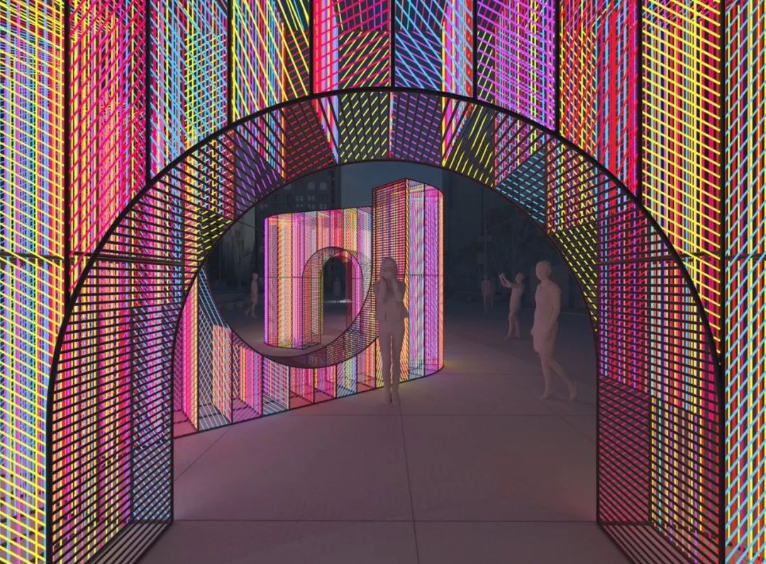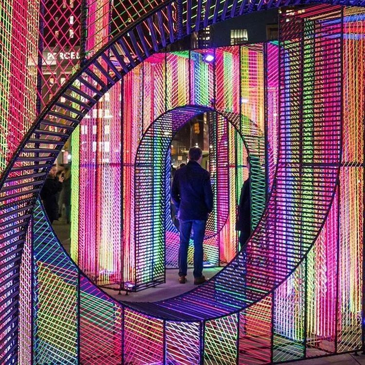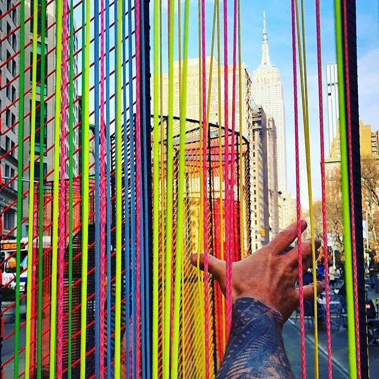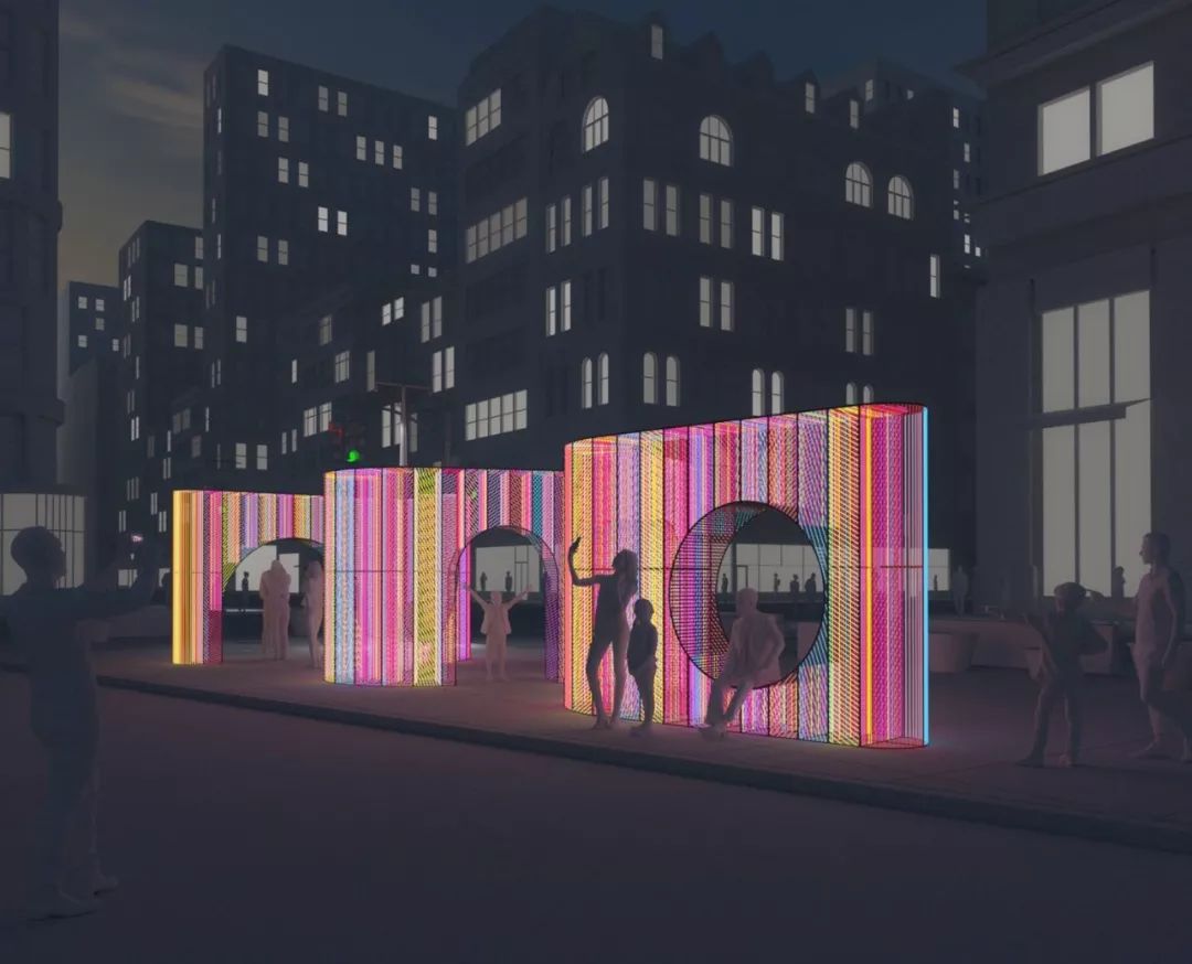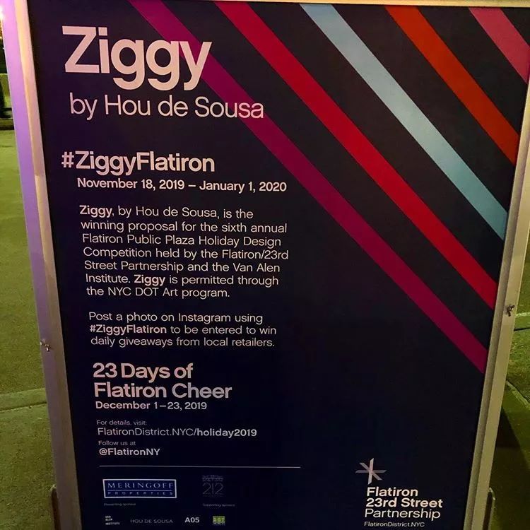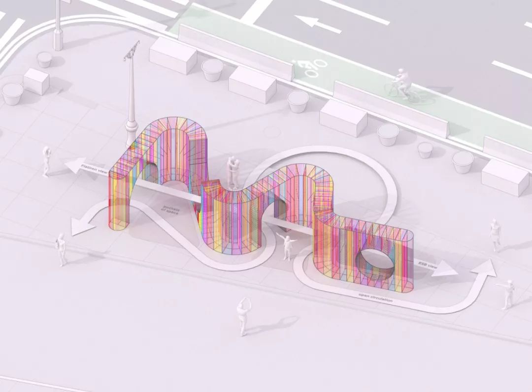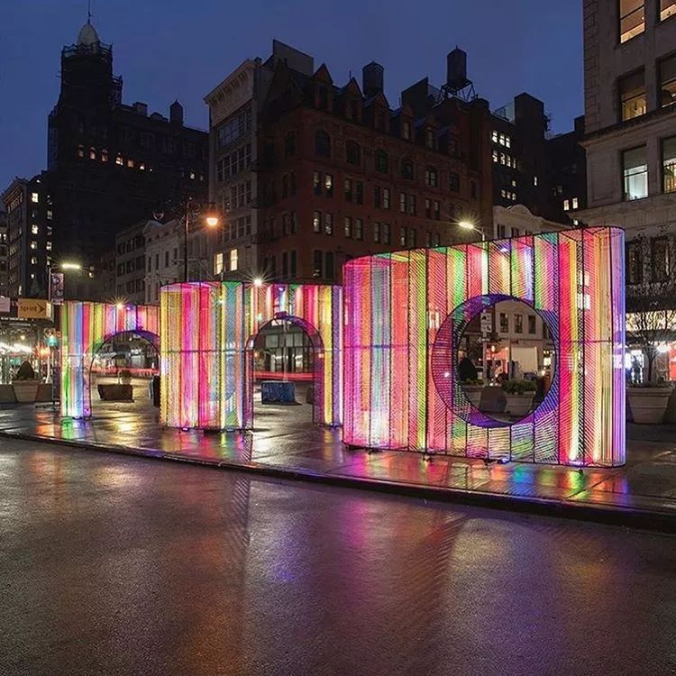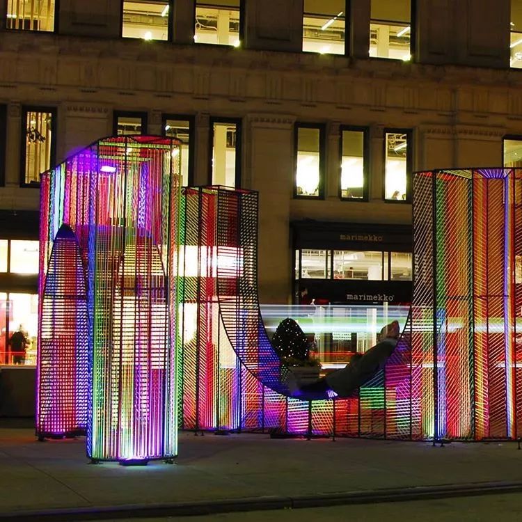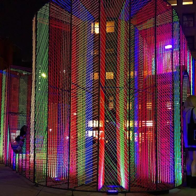 中建筑工作室hou de sousa的Ziggy是一件弯曲的彩虹灯光装置,展位于Broadway,Fifth Ave和23rd St之间,以鲜艳的色调和俏皮的手法庆祝节日。Hou de Sousa的设计建在Flatiron的三角形的地块上,将自己置于狭窄的场地限制内,并采用了与周围建筑相呼应的尺寸。黑色钢筋包裹在27,000英尺(8229.6米)的绳子中,形成彩色的幻觉,并通过变化的颜色、图案和光线动态过滤周围的环境,邀请路人坐在明亮的灯光和彩色图案中互动,拍照。一系列的开口和门槛构成了熨斗区的景点和地标,同时也欢迎游客坐下来与结构互动。对于那些寻求休息的人来说,也是一个绝佳的小憩场所。三个带有圆形开口的空间,圆形开口用于构筑相邻的地标,并形成可弯曲的长凳以供就座。
