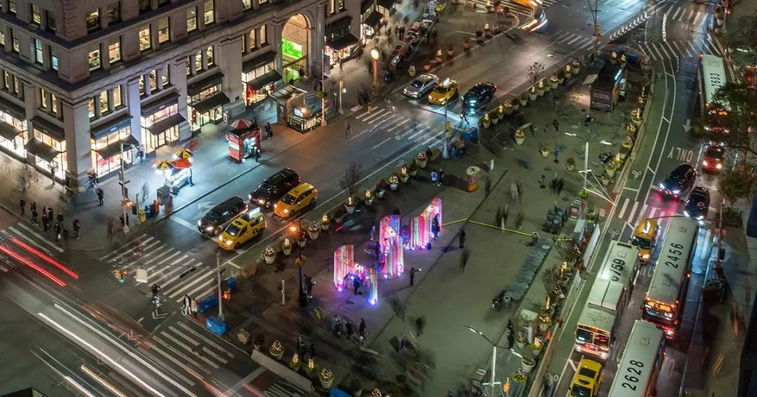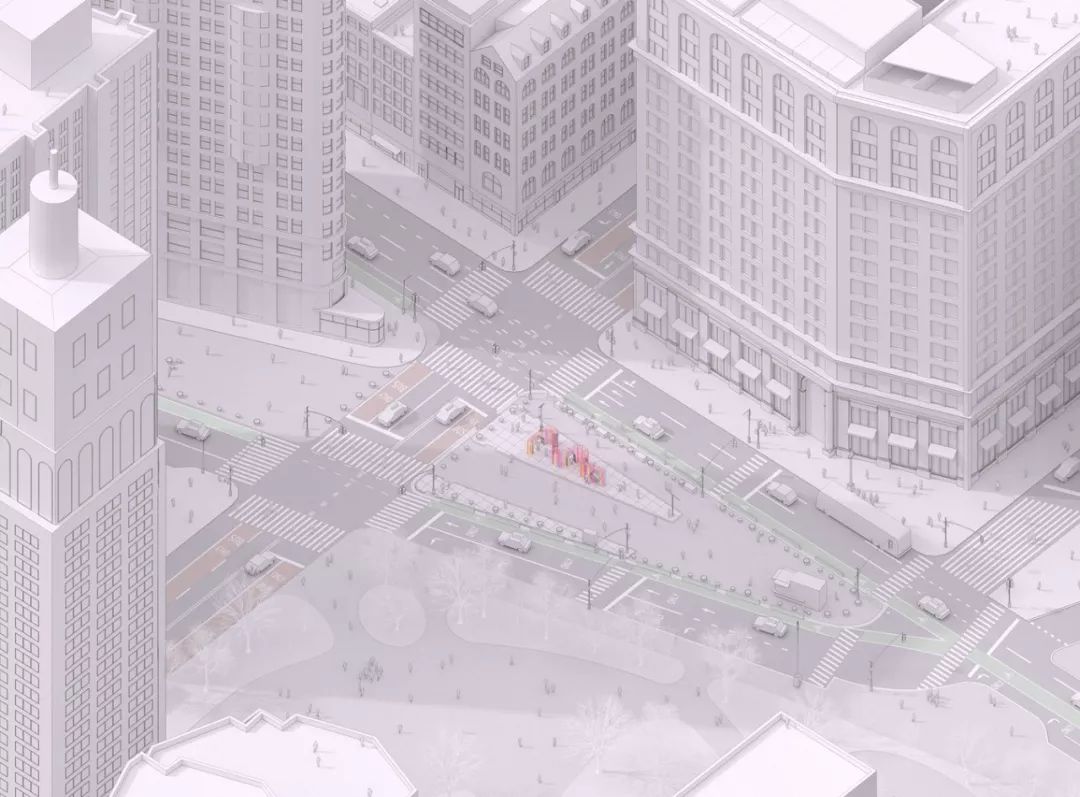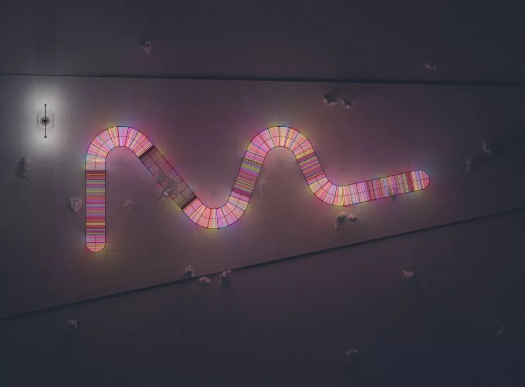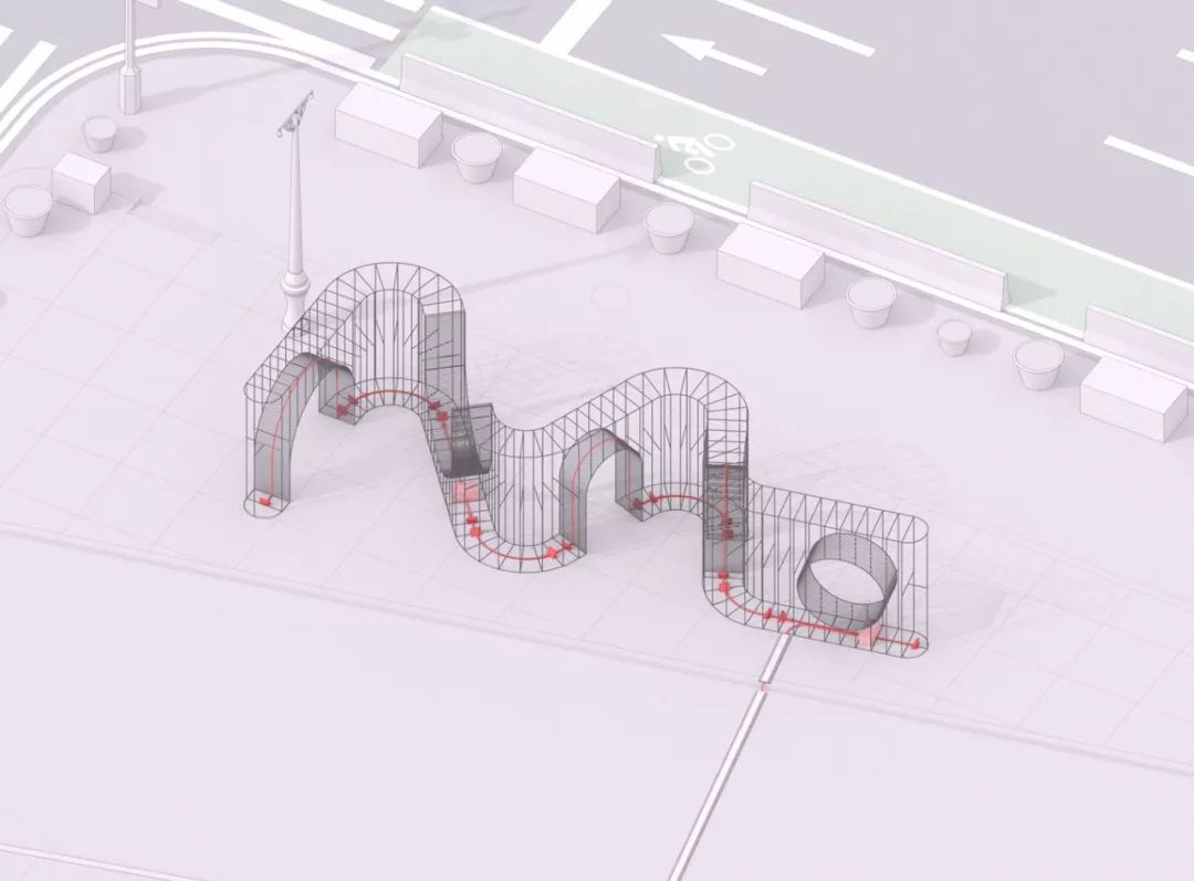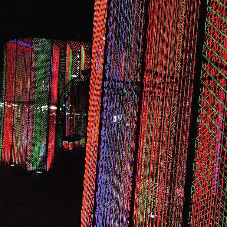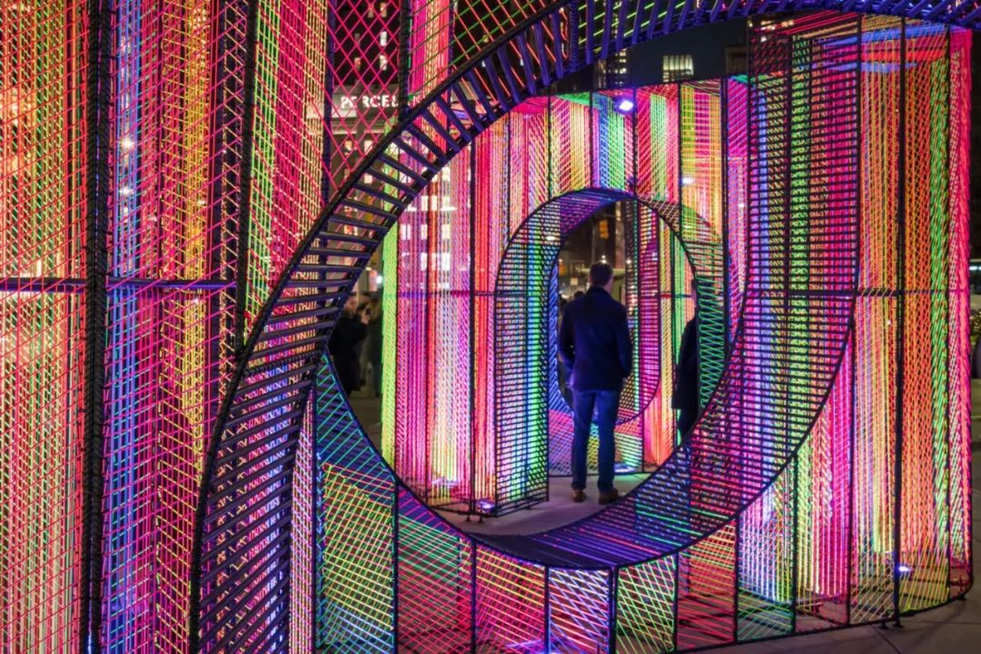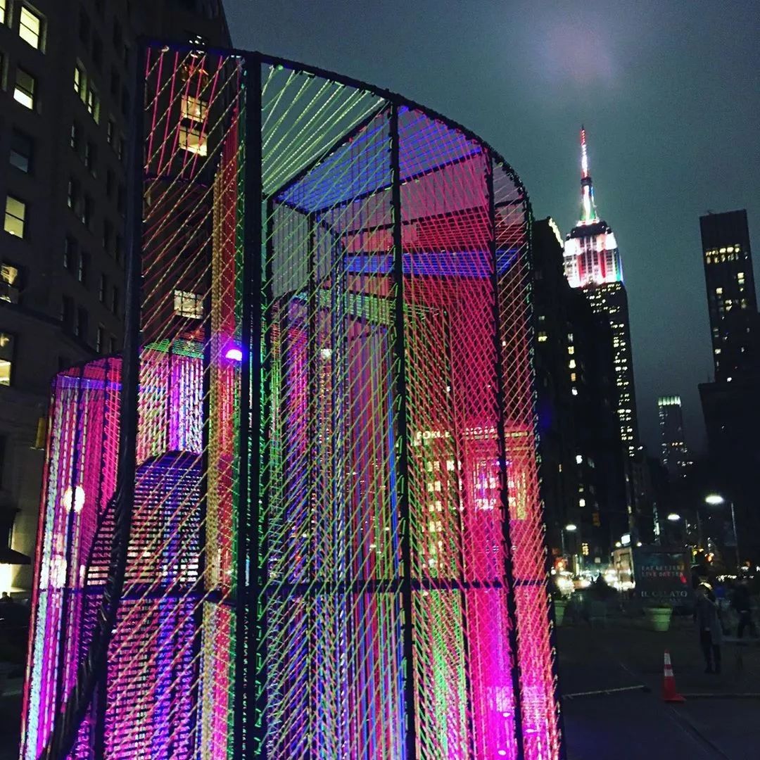 中建筑工作室hou de sousa的Ziggy是一件弯曲的彩虹灯光装置,展位于Broadway,Fifth Ave和23rd St之间,以鲜艳的色调和俏皮的手法庆祝节日。Hou de Sousa的设计建在Flatiron的三角形的地块上,将自己置于狭窄的场地限制内,并采用了与周围建筑相呼应的尺寸。黑色钢筋包裹在27,000英尺(8229.6米)的绳子中,形成彩色的幻觉,并通过变化的颜色、图案和光线动态过滤周围的环境,邀请路人坐在明亮的灯光和彩色图案中互动,拍照。一系列的开口和门槛构成了熨斗区的景点和地标,同时也欢迎游客坐下来与结构互动。对于那些寻求休息的人来说,也是一个绝佳的小憩场所。三个带有圆形开口的空间,圆形开口用于构筑相邻的地标,并形成可弯曲的长凳以供就座。