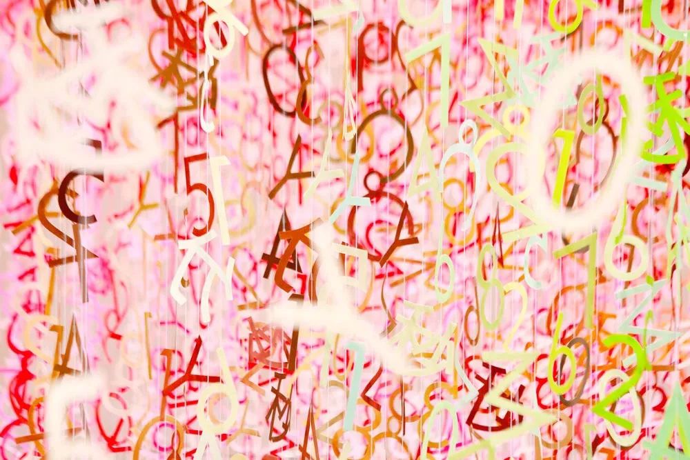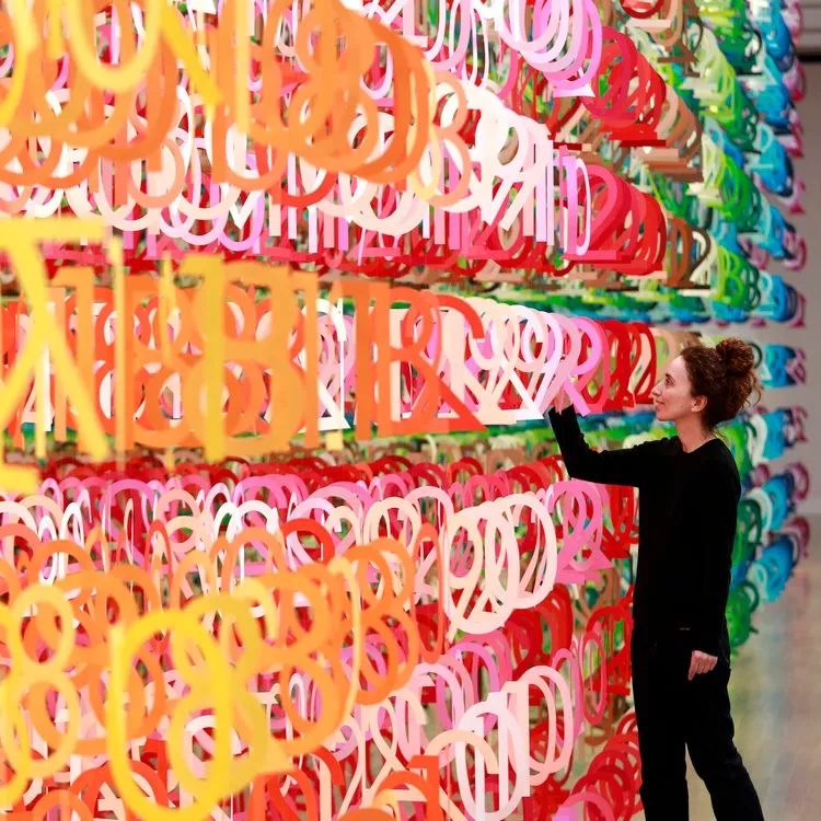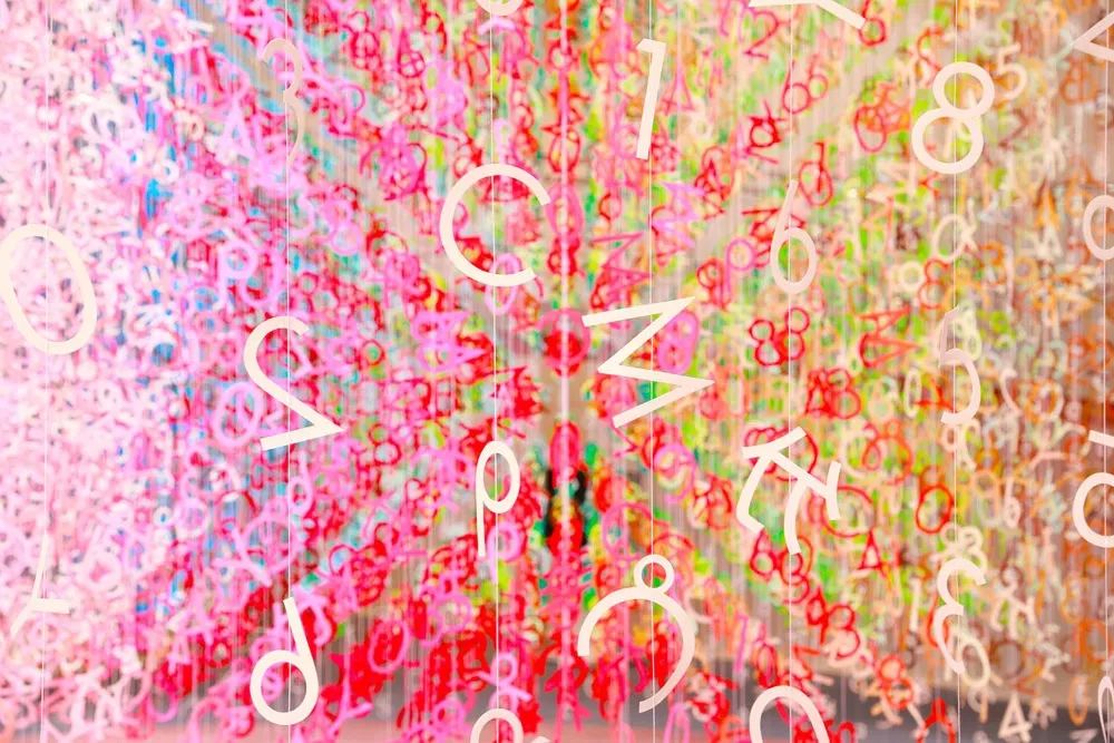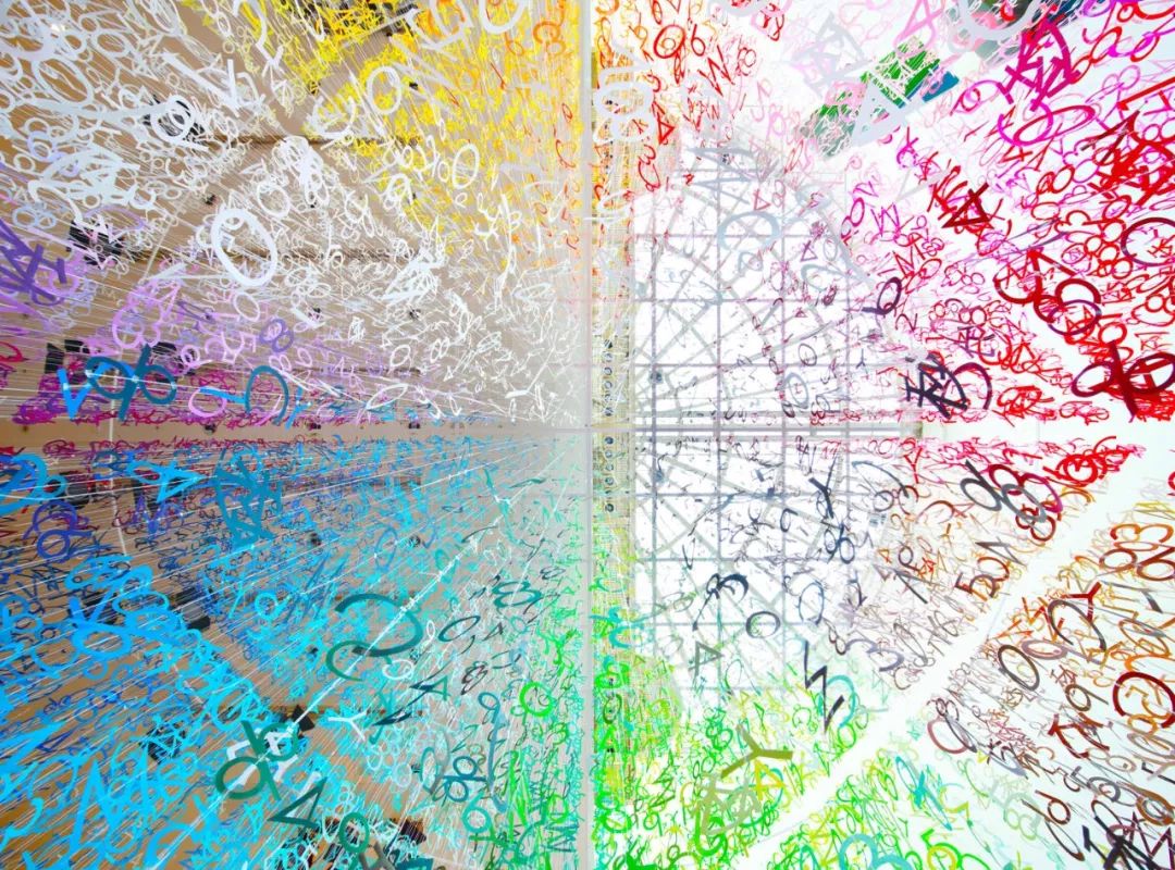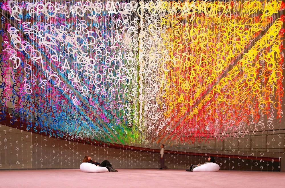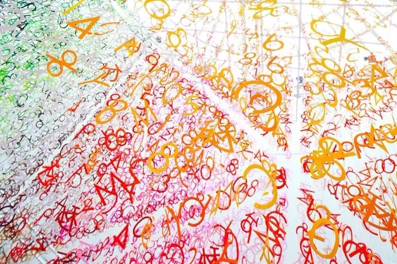 这17种构成这个食谱的符号被染成1000种不同的颜色,它们被剪成符号的形状,用线连接,然后悬挂在螺旋花园(螺旋,东京)中庭的中心。