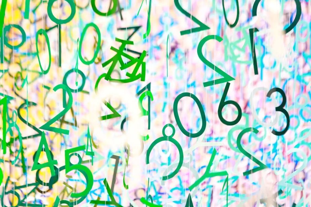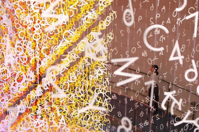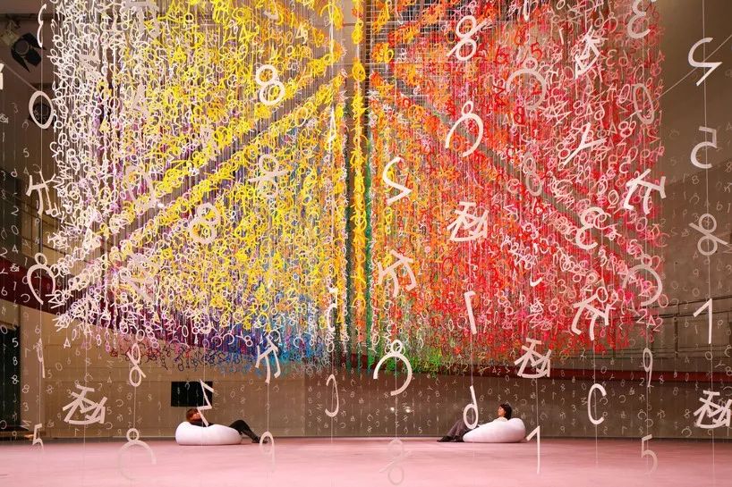 通过对所有这些元素的精确管理,在被切割成数字的形状之前,颜色之间微妙的差异被创造出来,并与线相连,悬挂在天花板上。当从下方观察时,每一个独立的悬架都阐明了实现每种颜色所必需的公式,它们组合在一起形成了一个三维网格,包裹在未染色的白色符号中。