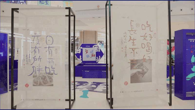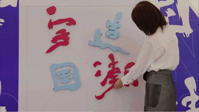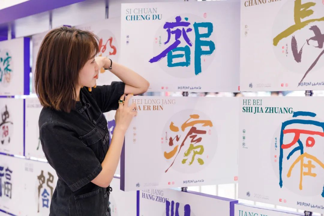两旁长长卷轴上印画着黄陵野鹤书法作品,大笔挥墨的潇洒和吸睛大气的配色,到底是大师级别,字符间都透露着他的人生态度。方块叠起,组成一面字符墙,24座省市名称用字符构成的方式呈现出来,拨动字板,仿佛看见娟秀的文字在眼前灵动了起来。漂浮在空中的字符,排列组合又能显现出不同的字词,别看它简单随意,但拗起造型拍照打卡,分分钟羡煞朋友圈!