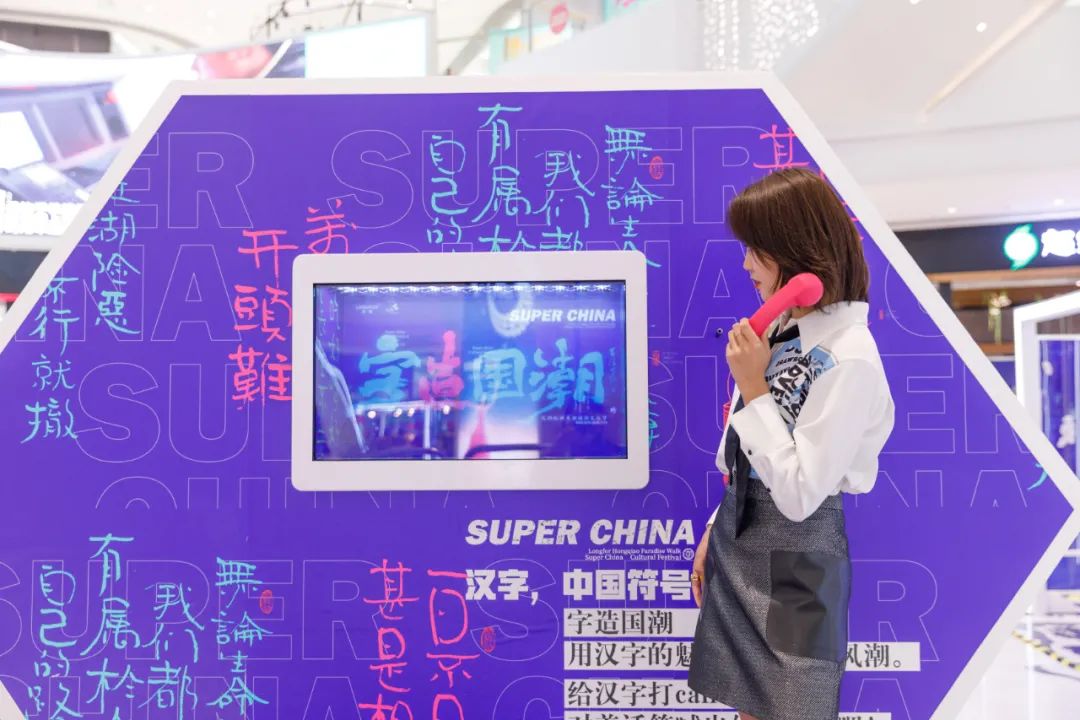 零散排开的字符,拼好后「字造国潮」四个大字呈现在眼前,背面的电话也不是摆设道具,对着话筒念出想要的文字,展示柜中便会慢慢的浮现出来。打破传统,又回归本源,小小的文化节里蕴藏着深厚的含义,SUPER CHINA国潮文化节惊艳旁人。