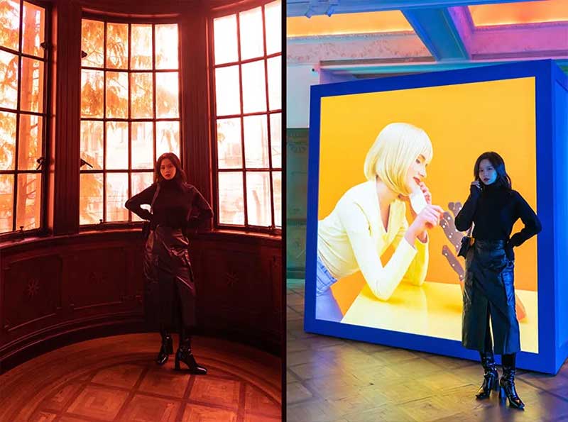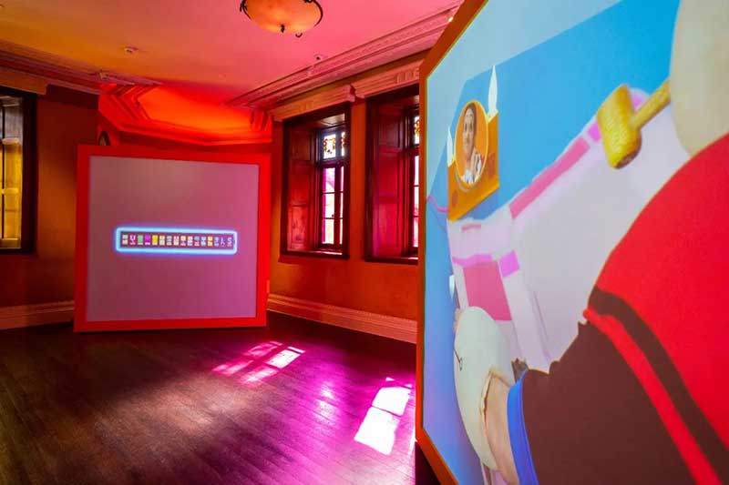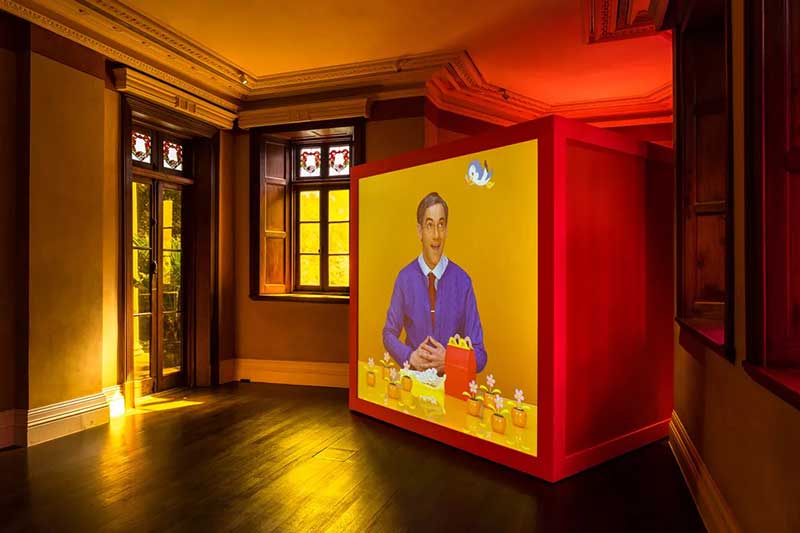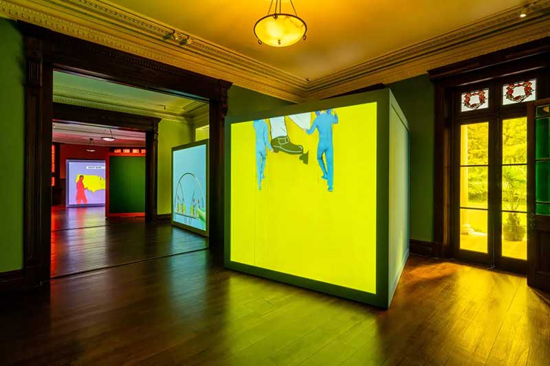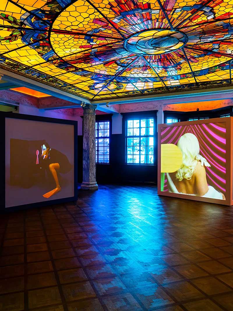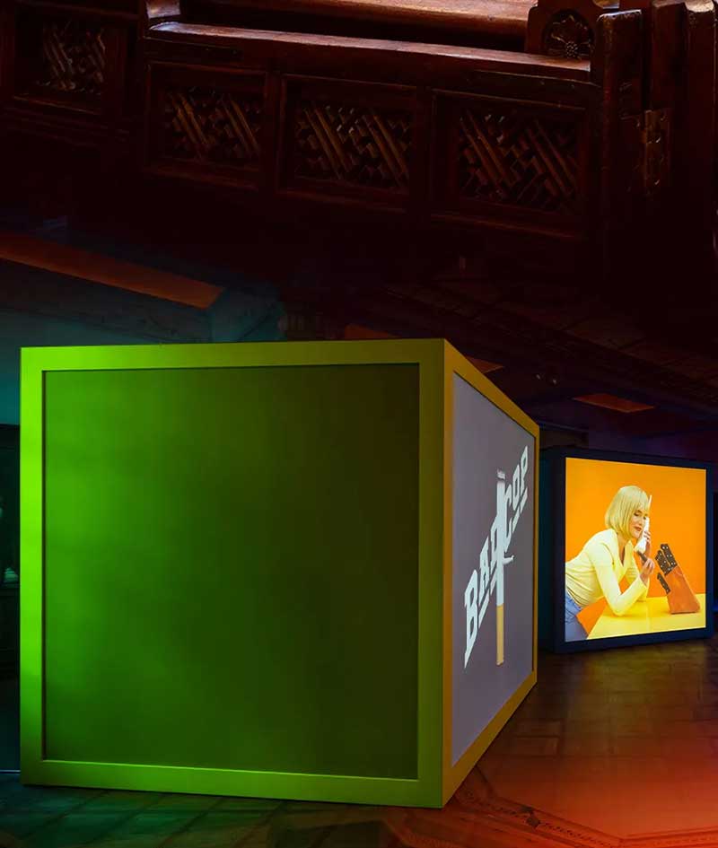从踏进Prada荣宅的那刻起,你就已经置身于一件“整体艺术”作品中,Da Corte的一切创想都在悄然上演。全新展览形式,能让观众更忘我地投入,藉由“所见所闻所感”,探究充满想象力的艺术核心。步入展厅,首先注意到的就是光影变幻。所有窗户都贴上有色玻璃膜,给映照进来的阳光镀上七彩属性。分布于两个主楼层的19个大型背投影立方体特别抢眼。极具现代气息的几何形艺术装置,与Prada荣宅复古格调意外相遇,打破相距百年的时间桎梏。