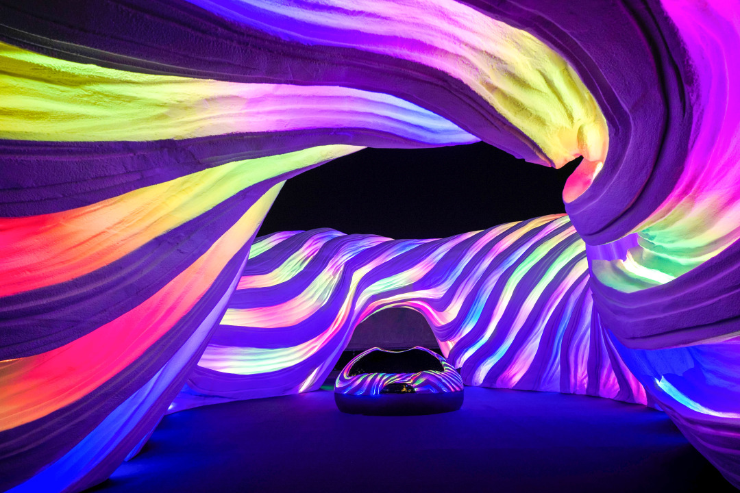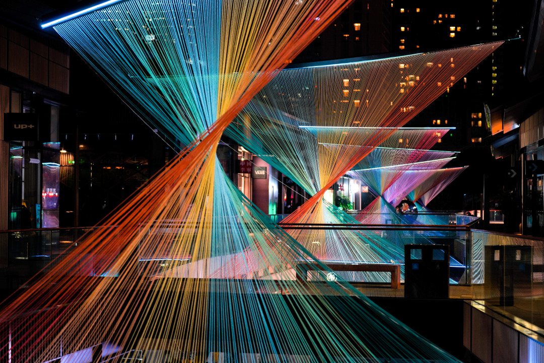 成都远洋太古里此次特别邀请青年新媒体艺术家钱泓霖,以艺术化的创新手法,展现宇宙的星河灿烂、光影流转。位于漫广场的“时空之眼”,共有9条流线型凹槽,依随结构镶嵌18根幻彩灯带,并通过来源于慕尼黑天文台和NASA的开源太阳黑子数据驱动灯光实时变化。庞大的数据从1818年一直记录到2019年,让人们站在成都远洋太古里的“时空之眼”感慨历史漫长的同时,对深邃的宇宙时空心生敬畏。通过700多个球形灯所组成的流动色彩,中里的“无限之力”仿佛在夜空中展现宇宙的无穷无尽。与此同时,“平衡之美”、“好奇之心”和“想象之翼”三件作品也艺术化地诠释了宇宙中的平衡法则、黑洞和引力波的奥妙。