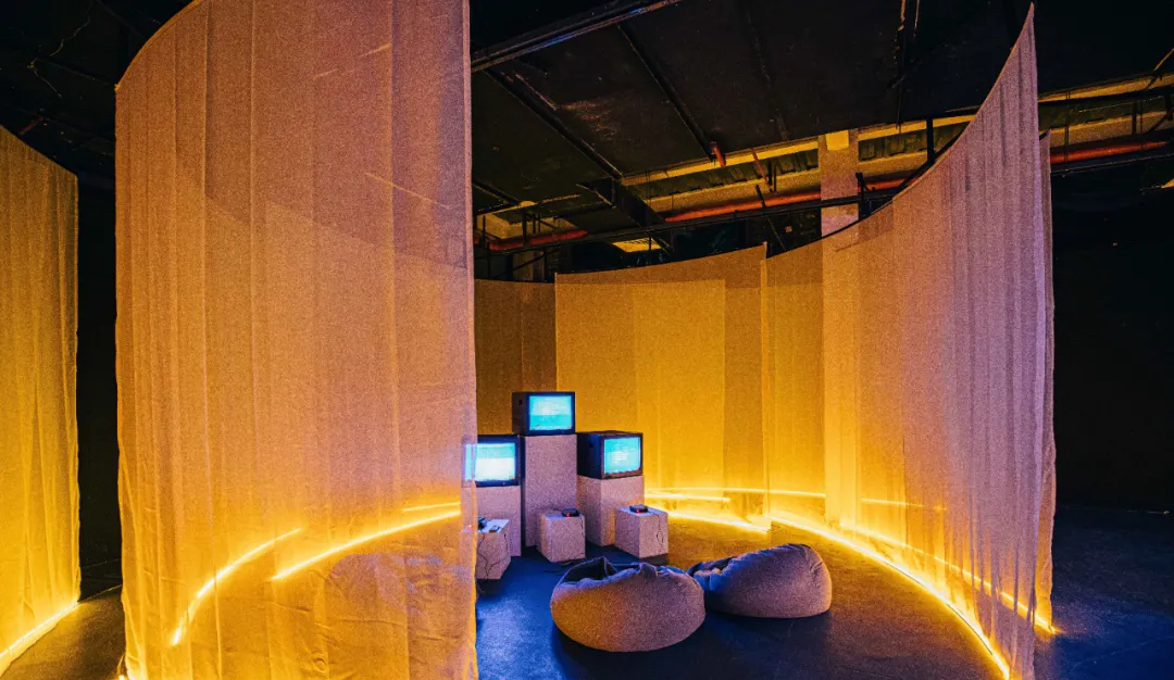 『可爱的声音』以游戏《普通话小镇》为原型,借助带着时代与集体记忆的公用电话为媒介,让观众直观体验到乡音的温情与普通话的社会性作用,并思考这种交流偏差会给人带来的生活困境。