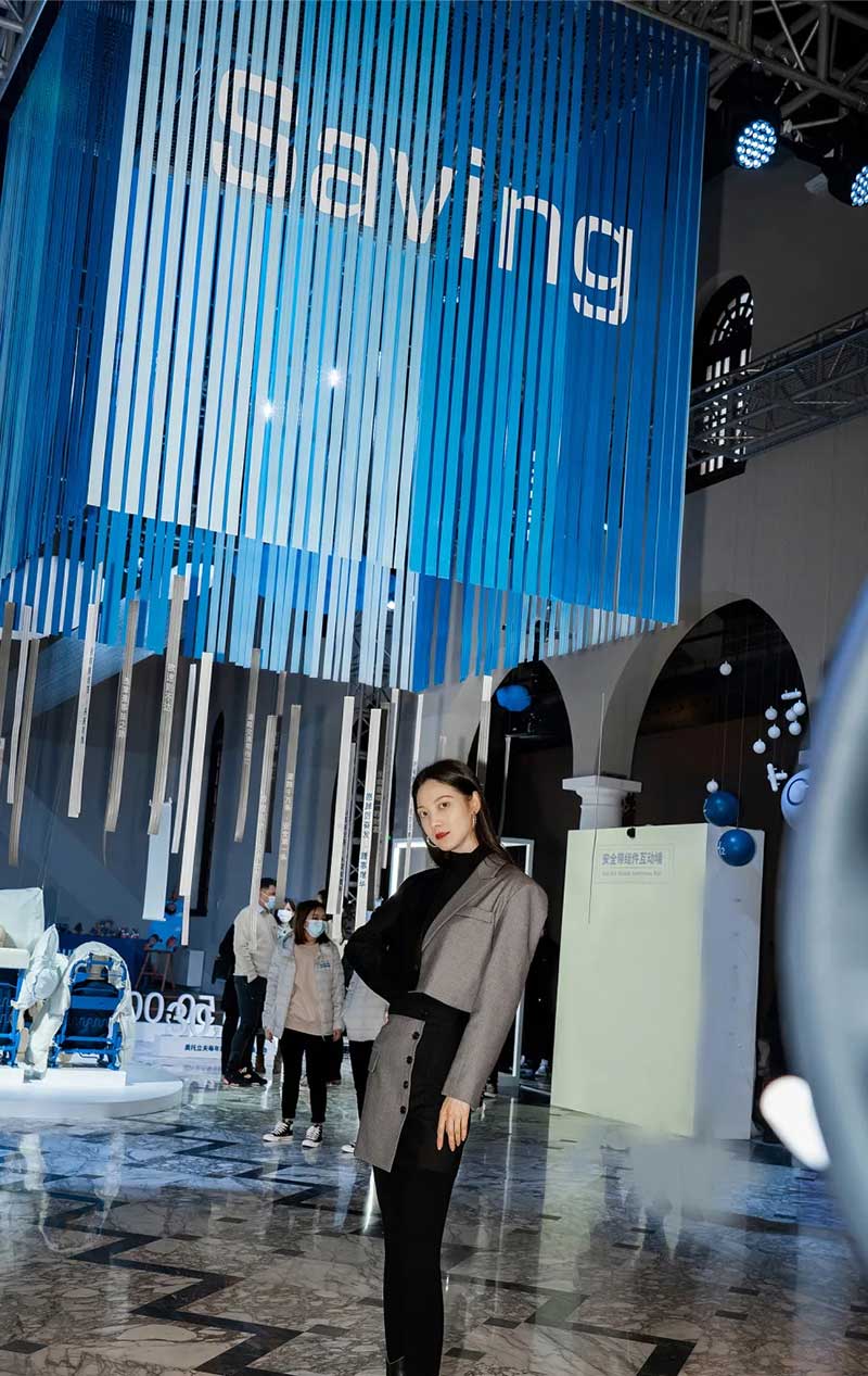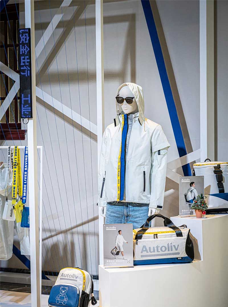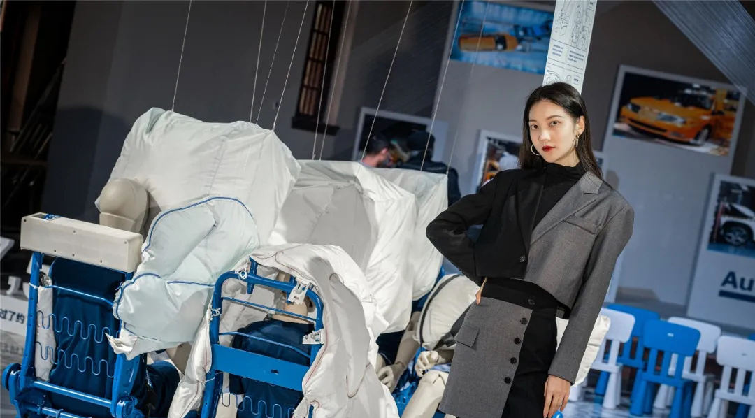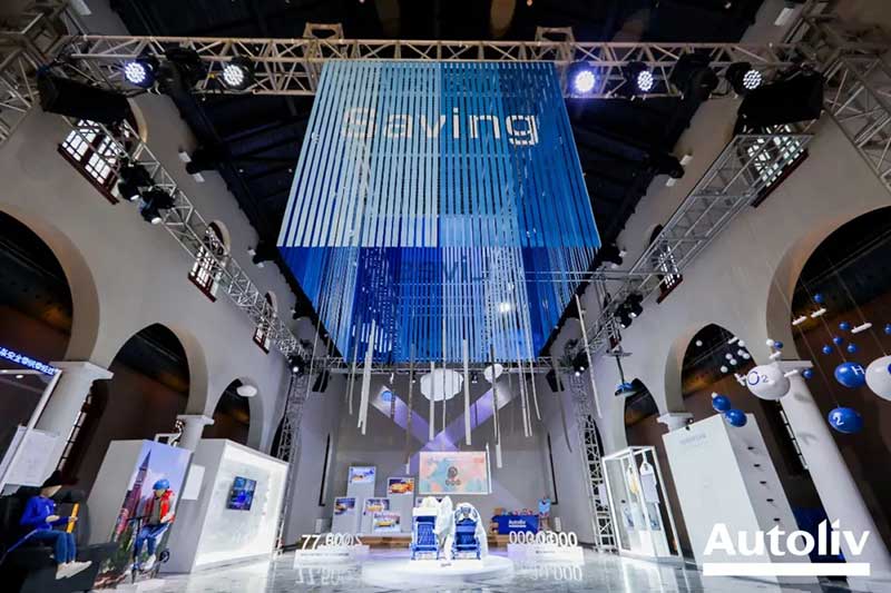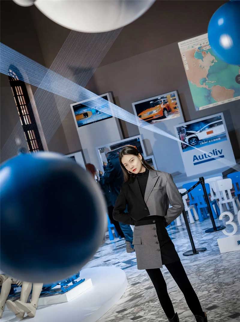 位于展厅中央的是交织成“X”造型的白色织带,由千丝万缕的安全带原材料纱线紧密编织而成,看似柔软,但当意外发生时,聚合在一起的它们就会拥有远超你想象的力量。悬挂在空中的蓝白色小球象征着氢气和氧气,展示的是安全气囊在点火发生器发生气体膨胀弹出的瞬间所产生的化学反应。