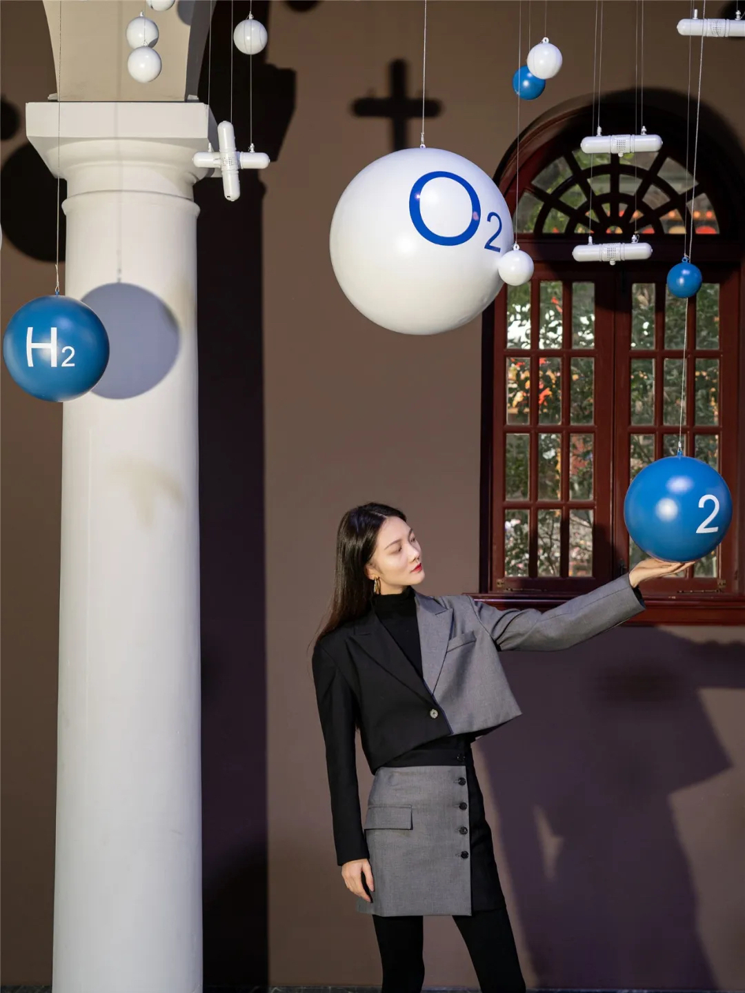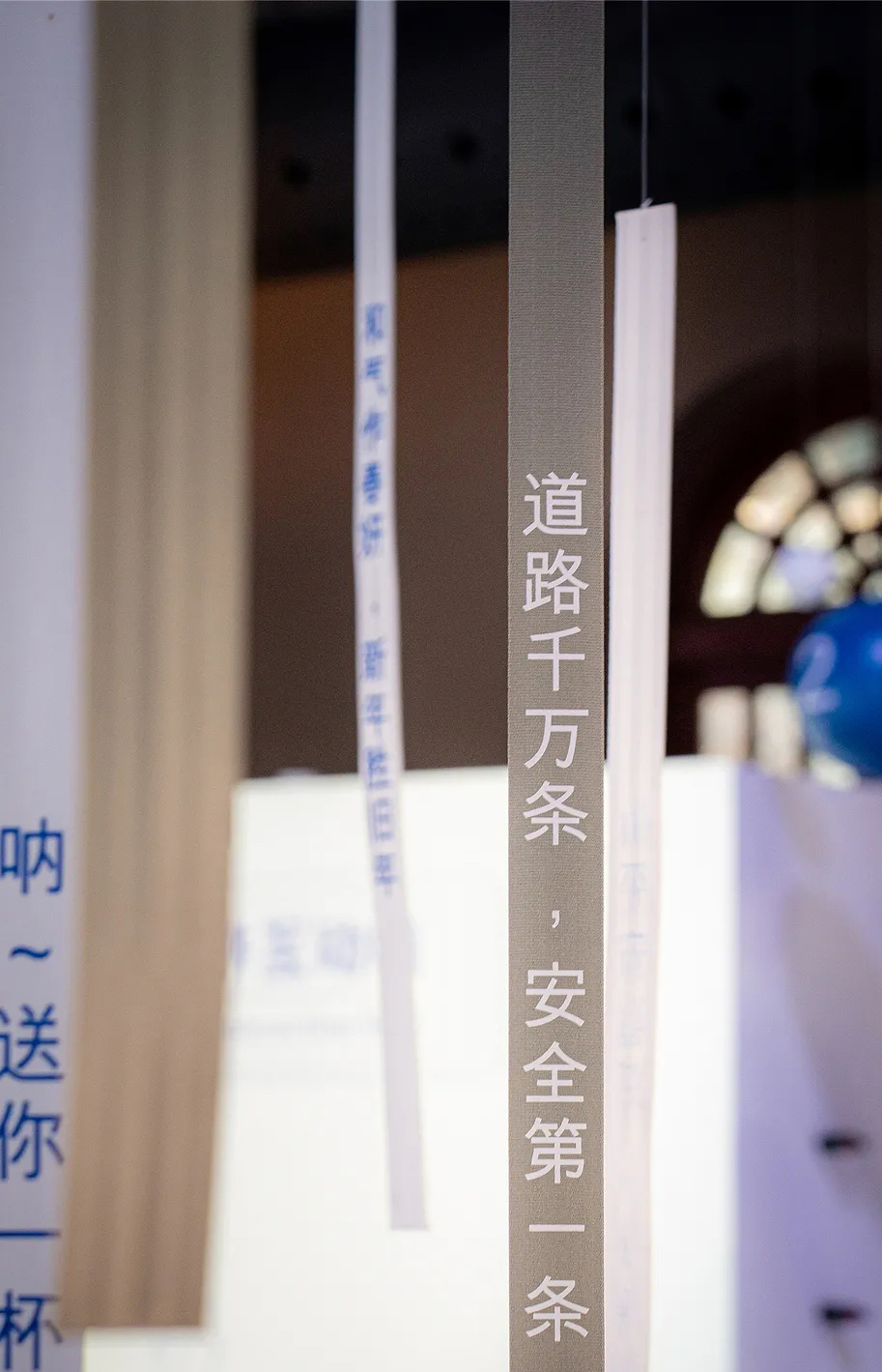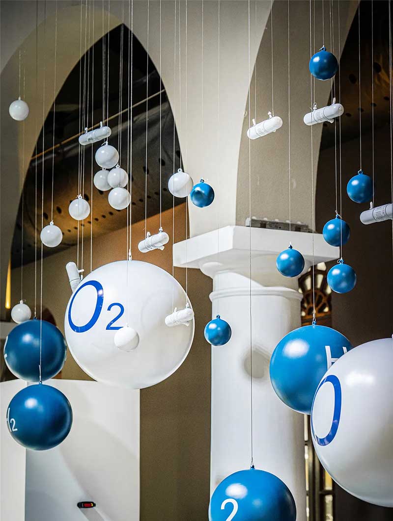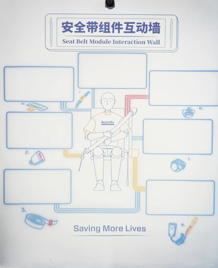 位于展厅中央的是交织成“X”造型的白色织带,由千丝万缕的安全带原材料纱线紧密编织而成,看似柔软,但当意外发生时,聚合在一起的它们就会拥有远超你想象的力量。悬挂在空中的蓝白色小球象征着氢气和氧气,展示的是安全气囊在点火发生器发生气体膨胀弹出的瞬间所产生的化学反应。