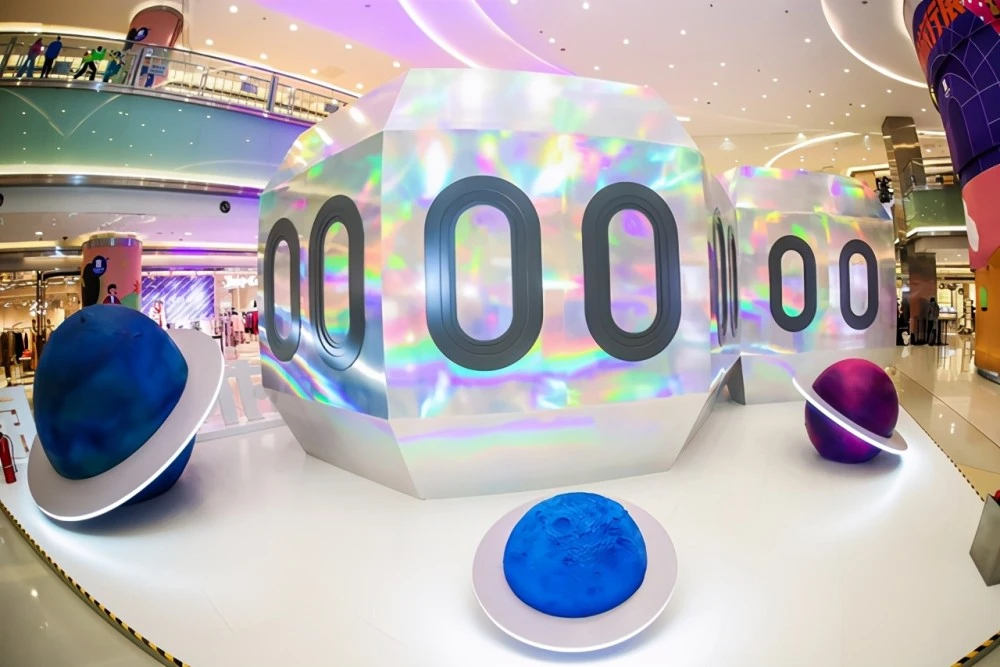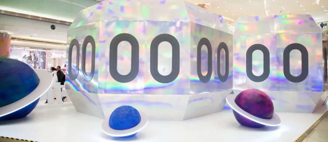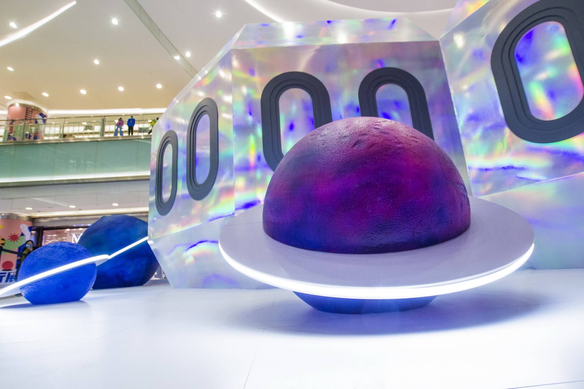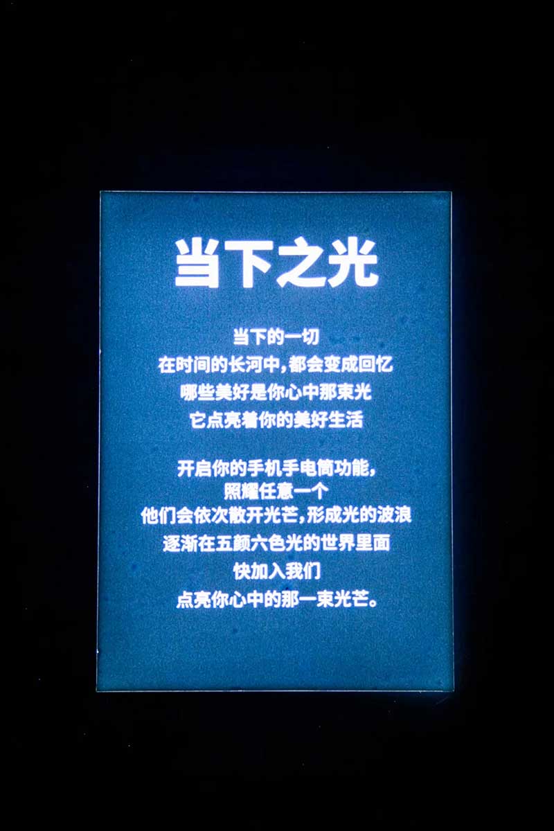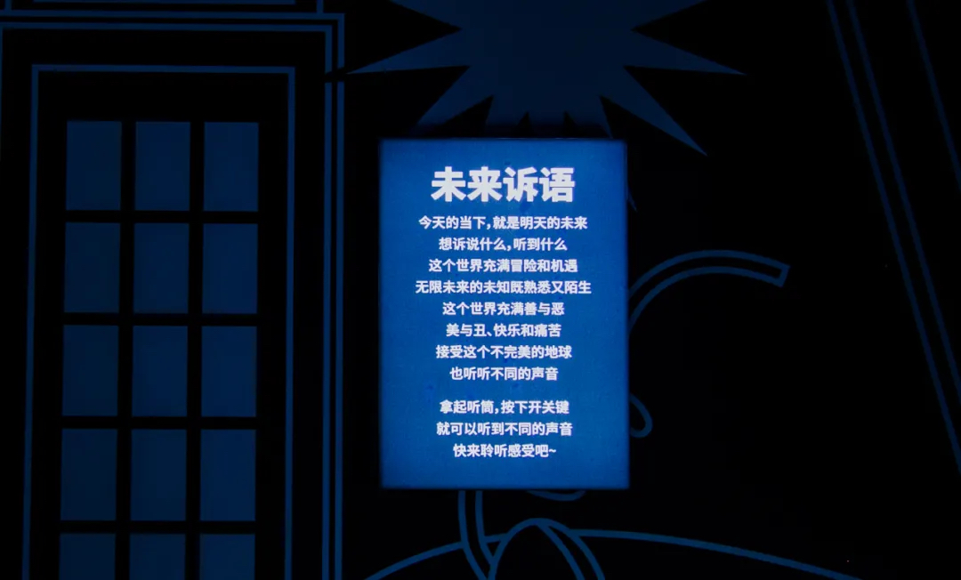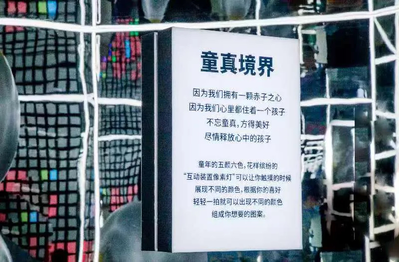 在童真境界,充满着小朋友喜爱的元素,大型牛牛公仔、跷跷板、哈哈镜和通过触摸展现不同图案的像素墙……大朋友也会在这个空间里找到儿时的旧时光。走进当下之光,空间里有着荧光闪烁,可以照亮脚下的位置,好似站在当下生活的中心,看着光依次扩散,感受这个由光点亮的治愈世界。在未来诉语空间能听到这个宇宙中各种熟悉又未知的声音,感觉像是脱离了现实,在聆听、想象未来。