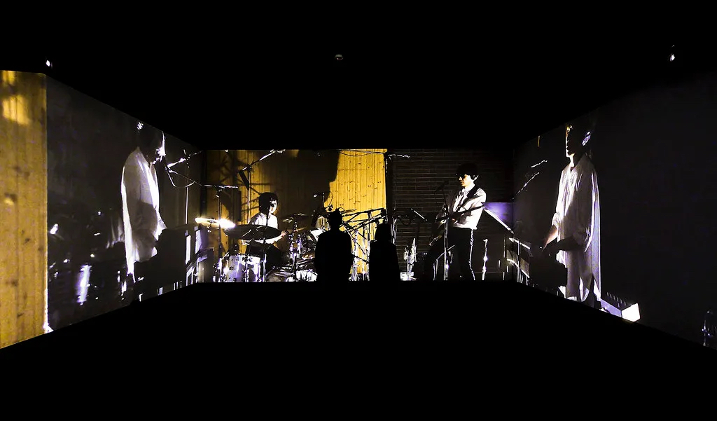 走入全黑的空间内,观展者需花时间走进画面、体会图像氛围,且沈浸其中。藉由策展人细腻地编排,人们便在共同的空间与时间下,重复性鉴赏同一音乐。全场将重点留给感官与创作之间的互动。