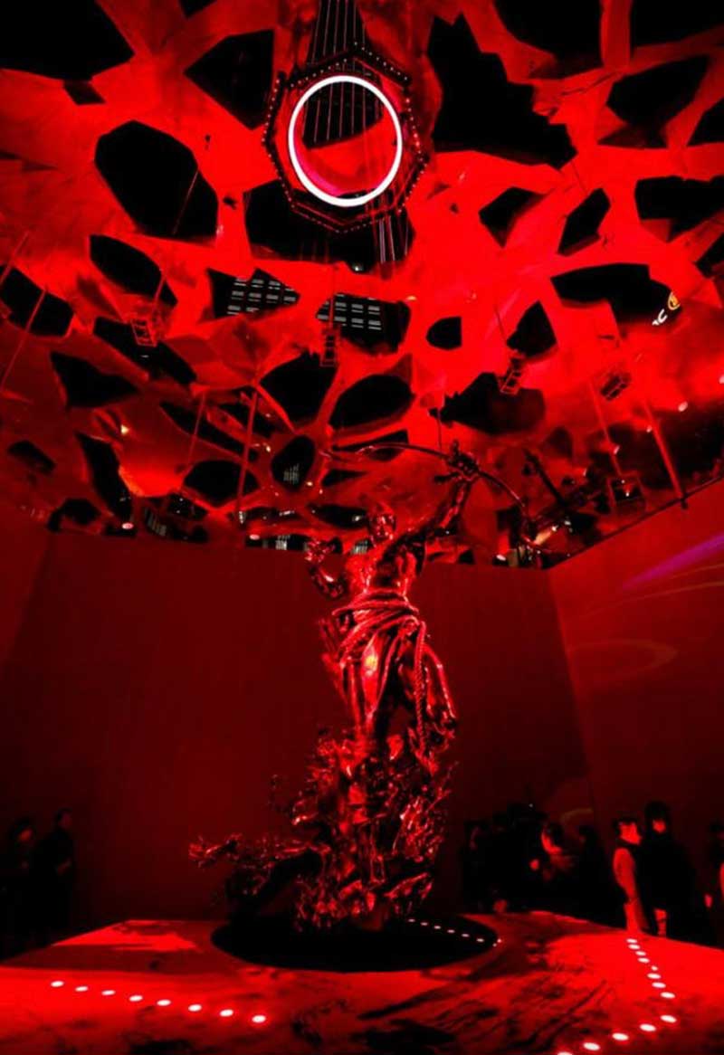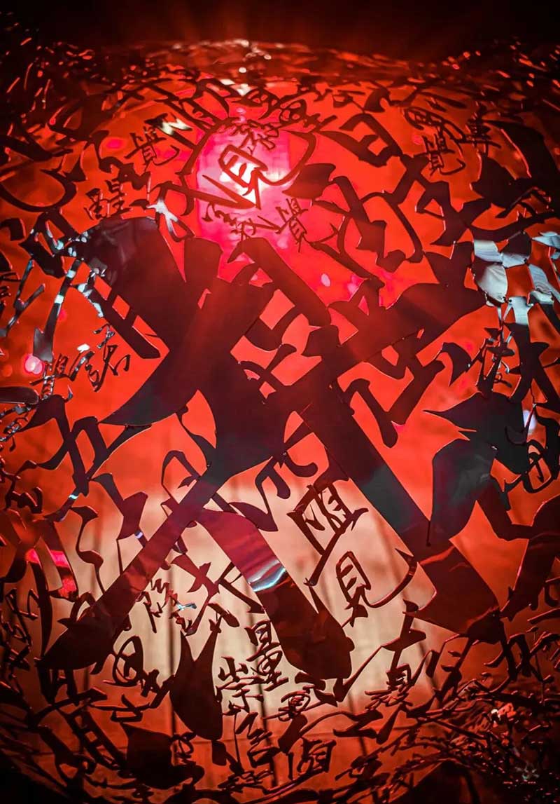 大型沉浸式艺术装置「赤子心」横跨了平安金融中心商场九至十层平台,总占地面积近四千平方米。在展出十五件大型雕塑作品的同时,将光影艺术与声音艺术巧妙融合,串联起虚拟影像与现实空间,以阐释纯粹、无畏的赤子之心。「赤子心」使观众走入艺术品内部、探索艺术家的内心深处,通过亲身参与展览并与之对话,从而理解「其大无外,其小无内,世界即内心投射」的本质。