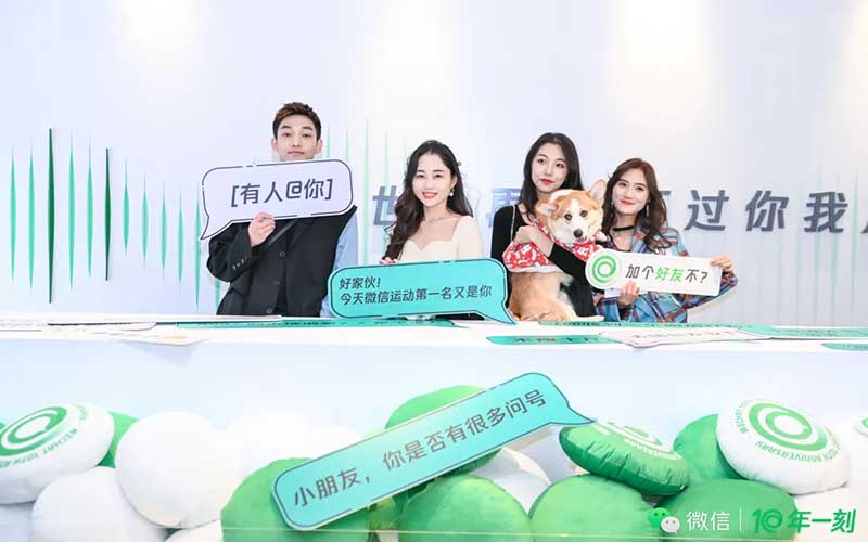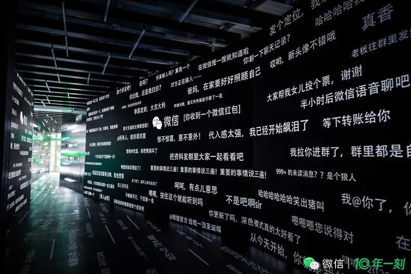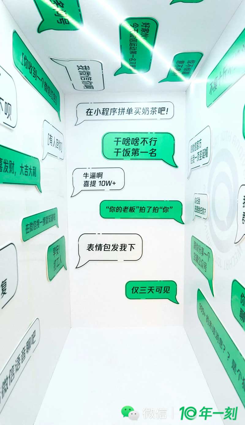 在微信十周年线下展览现场,设置了多个有趣好玩的互动区域。在由声音和光影组成的 时间「话」廊 里,收集了十年来在微信里被发出的 100 句话,「加个微信吧」、「天冷了注意保暖」、「红包抢到手气最佳!」……每一句,都是微信十年与你的时刻。