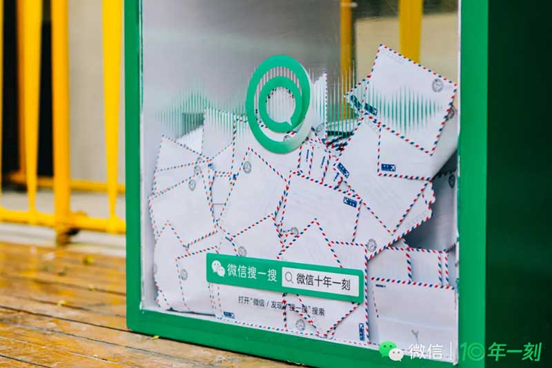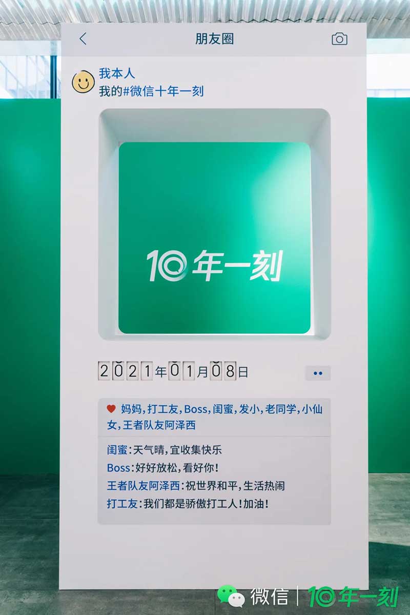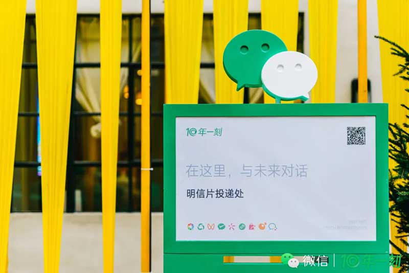 来到「十年一刻」主题区 ,一起回顾微信十年的每一个重要里程。走着走着,你会发现这里竟然下起了真人表情雨。还在好奇微信开屏页的小人是谁?快来跟3米高的「微信地球」合影,复刻那经典的一幕。我们相信,每一个微信ID,都是人在数字世界里的一个独立坐标,每一次 [有人@你],都是连接进行时。来「坐标之椅」坐坐吧,此时此刻,也是属于你的微信时刻。回顾过去后,你是不是对未来十年有了新的期盼?「未来邮筒」为你开启,将手中集齐4枚印章的明信片投入,一年后,我们将会寄出明信片,它会跟你再次见面。
