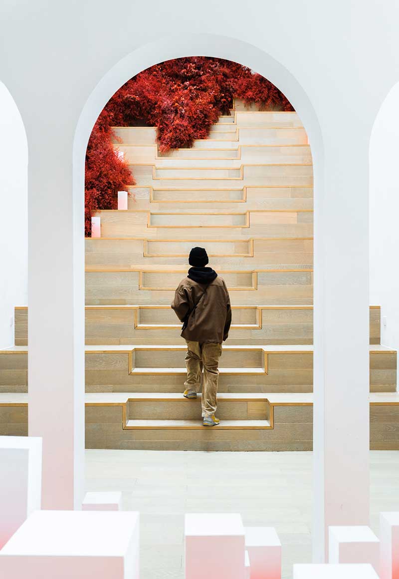 近2400m²的艺术空间通过“天梯”式的设计贯穿了两层楼。“天梯”除了通道功能外,更代表着安云的艺术感。3楼的空间主要以收藏艺术为主,而4楼则以“传递生活设计美学”为主张,定期引进国内外最新潮的当代设计和装置,所以这里每隔一段时间就会有让人眼前一亮的全新展览。