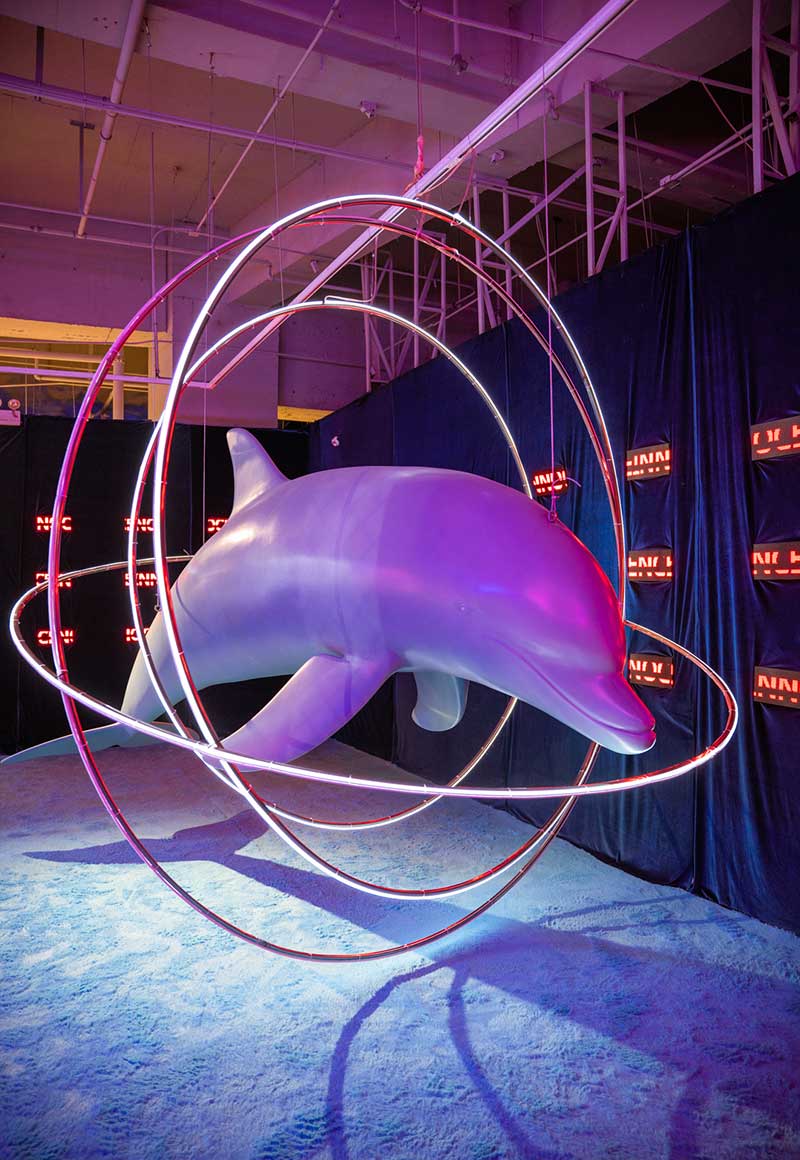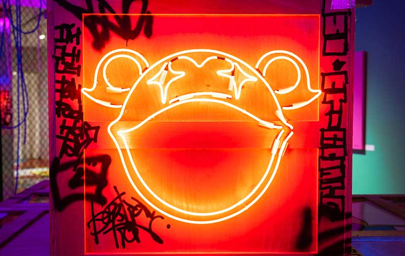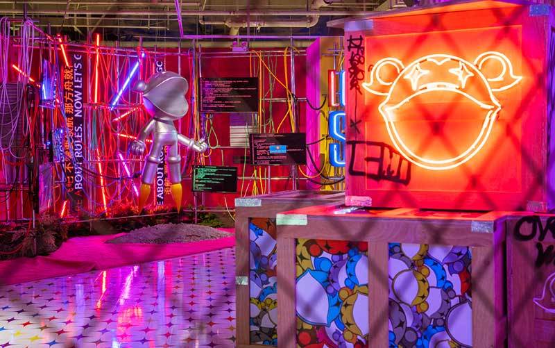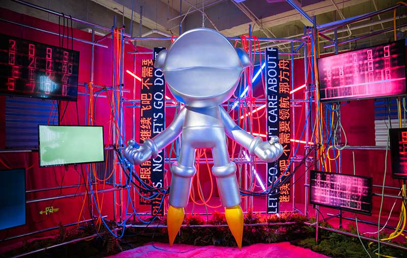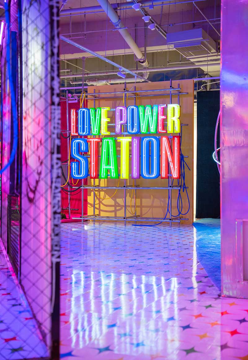 走进4楼的空间我们将进入到一个超现实的未来世界。由安云联手国内潮流艺术家池磊打造的「爱的发电站」主题展。暗紫色的霓虹灯光结合多彩的艺术装置,让你仿佛置身在一个赛博朋克风的未来世界。在这里,「爱」是海枯石烂,是星辰日月,是宇宙尽头。展览中的作品表达出了池磊对于爱的定义,你能在多彩的空间中看到他心中的海洋、日月和宇宙。