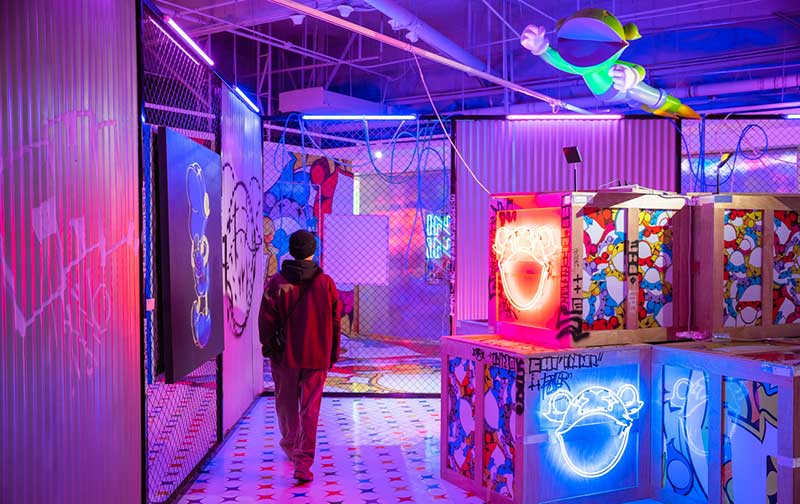 除此之外,在展览开幕当天池磊还邀请起现场的观众进行了一场即兴的涂鸦创作,所以我们在空间看到的涂鸦艺术都是开幕当天的作品。让观众一起成为展览的创作者之一,也恰好点亮了展览主题,通过创作一起为这个爱的空间发电。