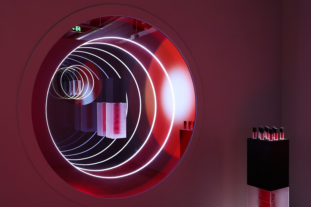 此次的“都市回弹空间”以全新绝色持久丝绒哑光唇釉的“嘭弹”特质为灵感,在繁华都市中打造了属于美宝莲纽约的艺术角落,也展现了美宝莲纽约的都市美学精神。TX 淮海的长阶梯放置的红色羽绒枕头,伴以弹力元素背景墙与之呼应。