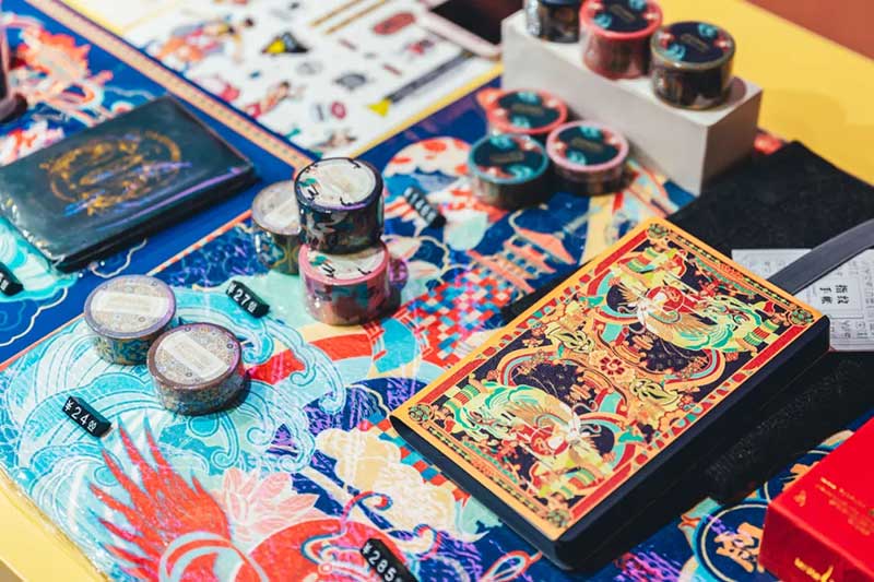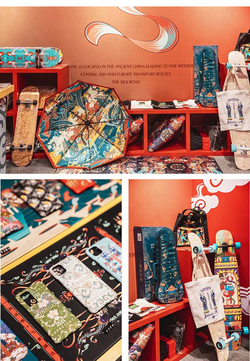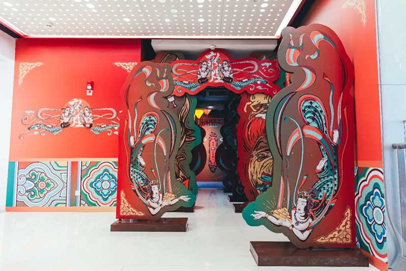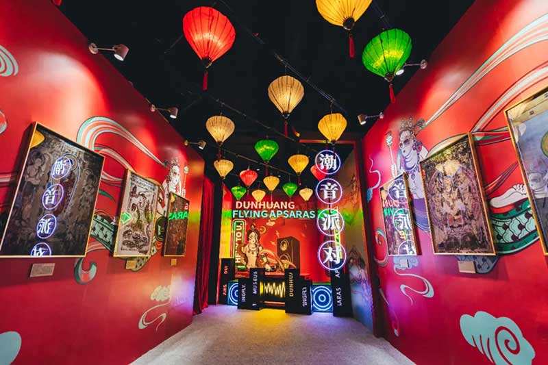 展览以梦境为灵感打造入梦、觅音、寻迹、造乐、点愿、珍藏六部曲,带来敦煌幻境之旅。在“入梦”入口,彩云层叠、彩带回旋,如同步入时空漩涡,坠入敦煌梦境,仪式感十足。进入“觅音”通道,邂逅灵动的飞天仙女,柔美多姿的仙女位于通道两旁,记录穿越幻境的人数。由飞天仙女指引,来到一场前所未有的潮音派对。这是潮咖们不能错过的“造乐”空间,飞天朋克重金属秀马上开启!跟随潮酷的敦煌DJ加入到这场潮音派对,现场氛围被瞬间点燃,多重感官被放大,收获满满惊喜。来到美轮美奂的“点愿”许愿点,在撩人的月影浮云中,许下新一年的美好祝愿。从“点愿”空间穿过,到达“寻迹”,寻觅千年敦煌足迹,邂逅巨型佛莲,化身飞天小仙女。最后抵达终点站:“珍藏”快闪店,敦煌博物馆近百件正品文创周边在此贩卖,瑰丽周边,让人一眼千年。