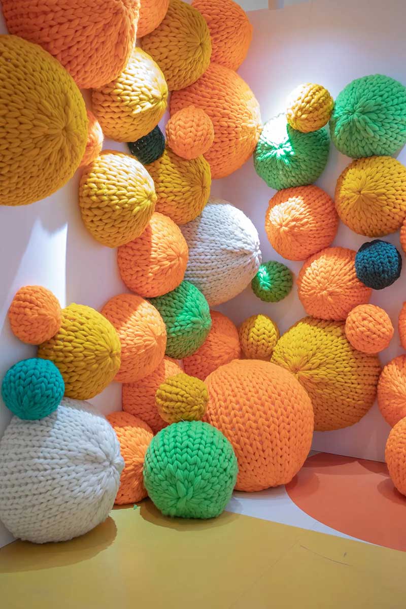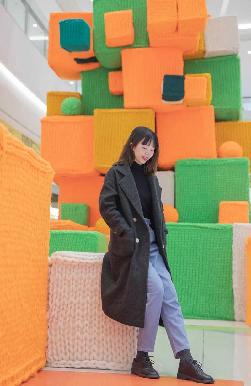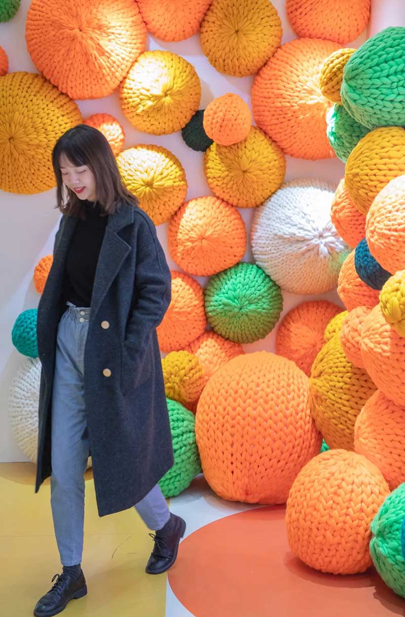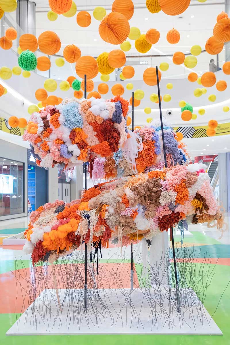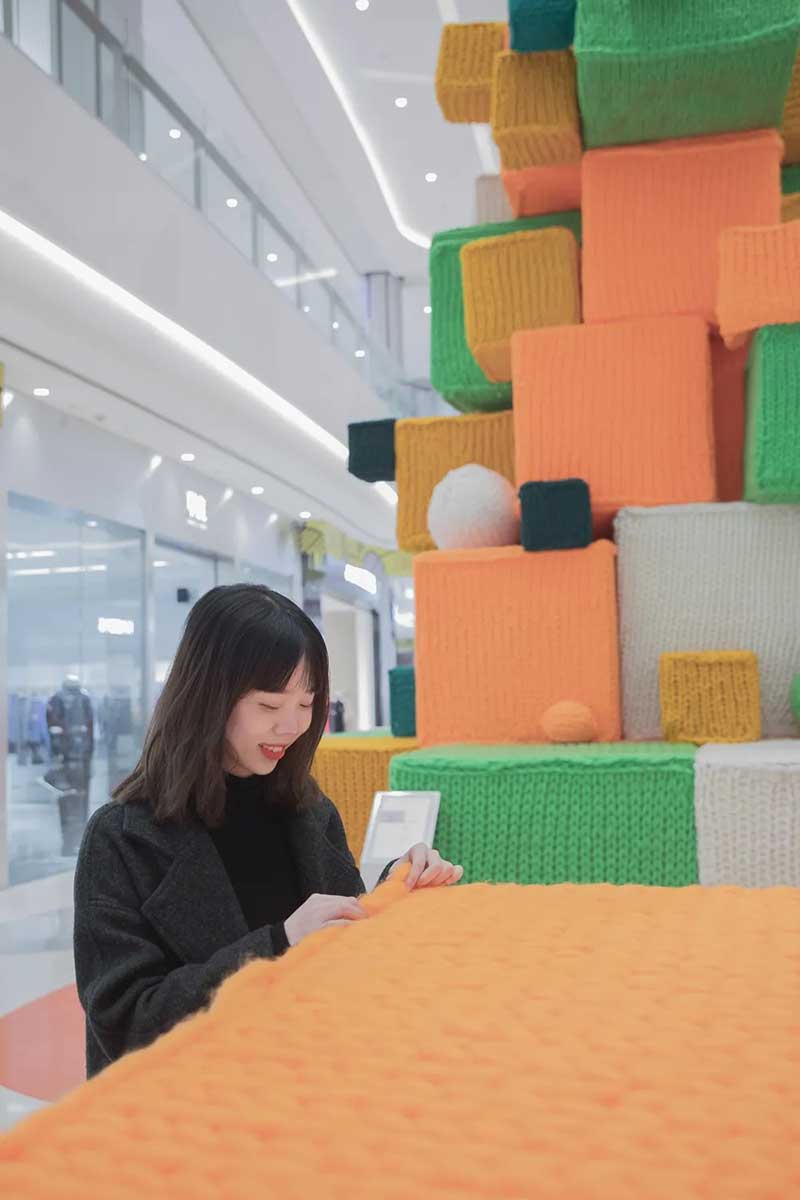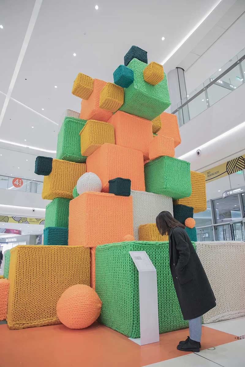 这盘联合川音成都美术学院创作的这场《织造新生》还蛮特别。6米高的巨型“毛线树”,由不同大小的方块、毛球层层叠叠组成。体积庞大,随便选一坨都好拍照,朋友圈气氛组小姐姐打卡快来。场地好发挥,颜色够好看,十分方便P图!