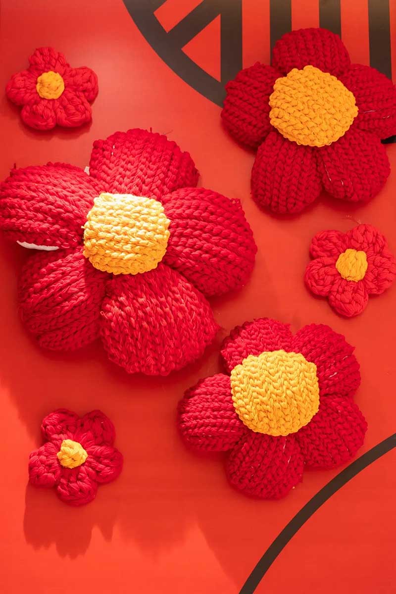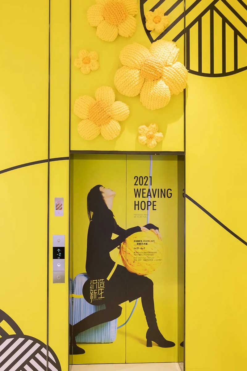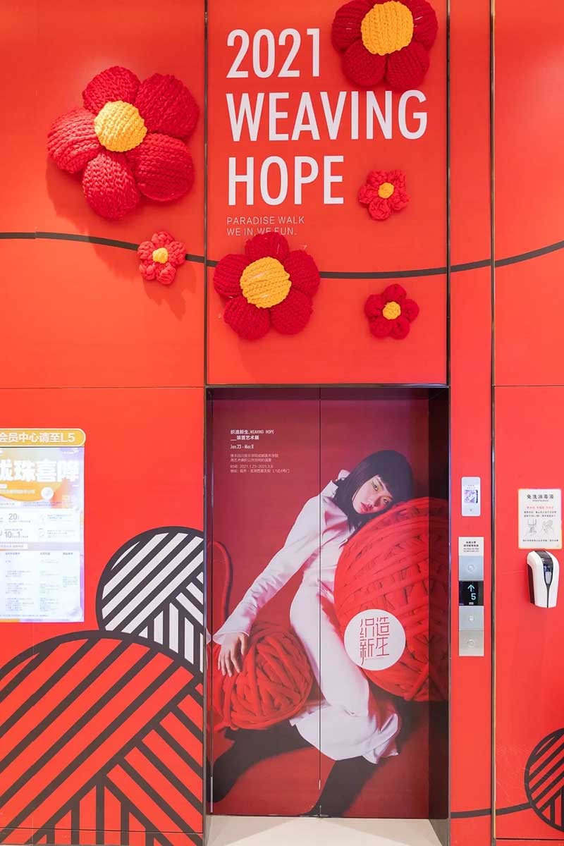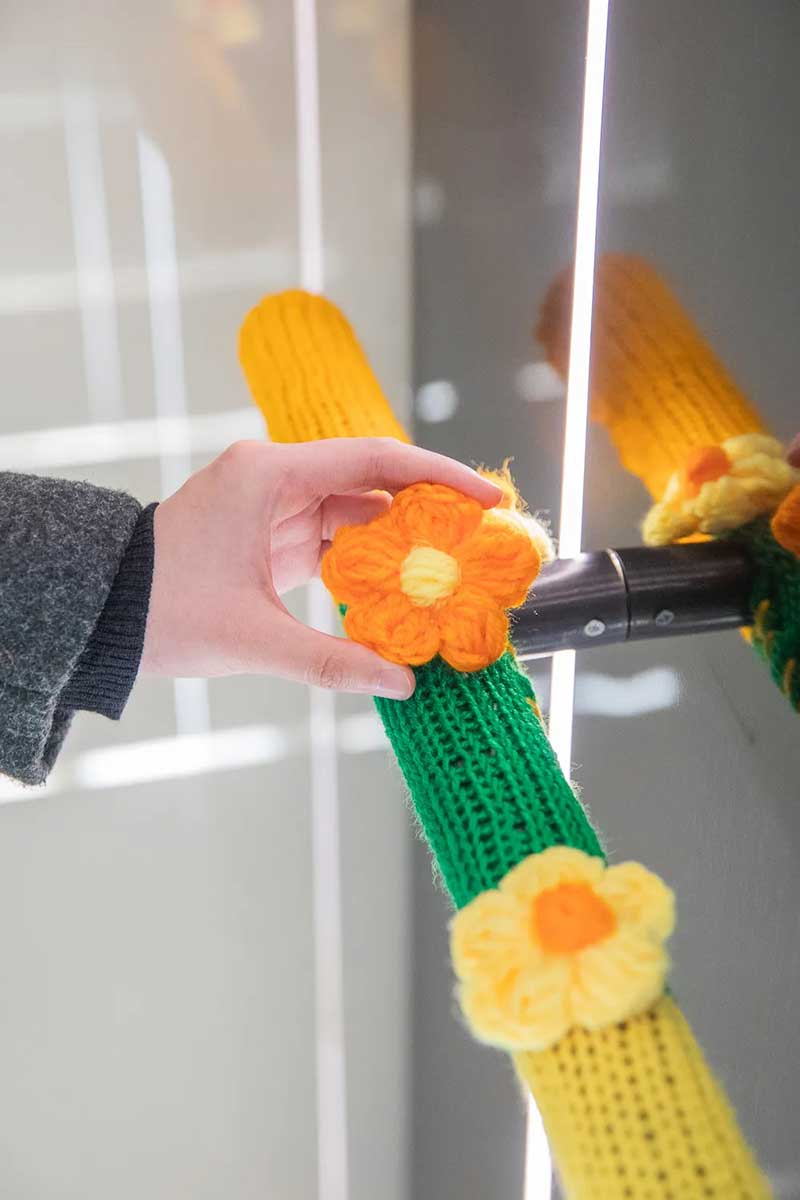 另外让人有点小惊喜的地方,一楼各处电梯口也有“泫雅风”的花朵造型织物,终于不是千篇一律的灯笼啊、福字啊、中国结啊,电梯内冷冰冰的扶手也穿上了毛衣,开出一朵朵小花,超可爱。