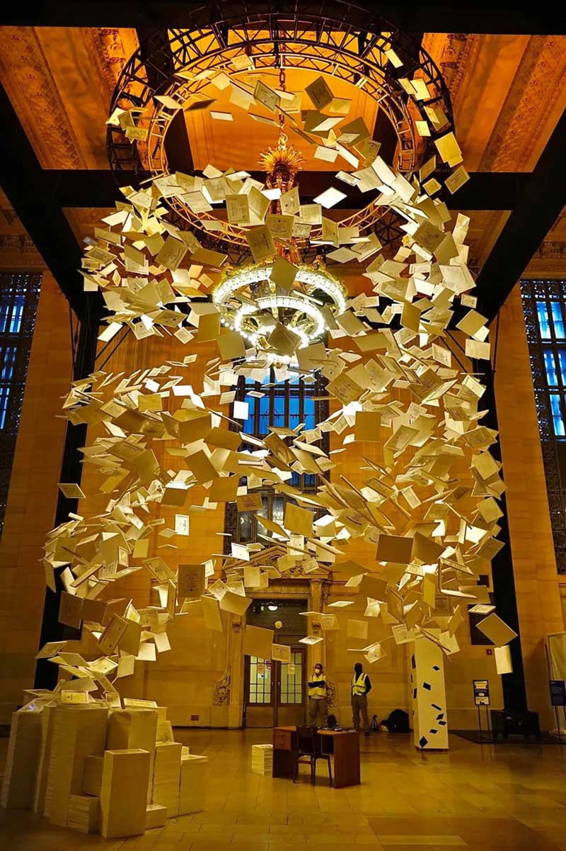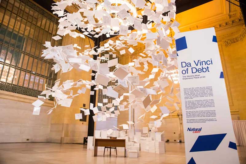 这个艺术作品是环绕着Vanderbilt Hall非常有代表性的吊灯盘旋而上,征收使用了2600张真人的毕业证书完成,很壮观。Natural Light将这称为“艺术作品”,讽刺一份份天价学费贷款造就了媲美达芬奇的艺术高度,百威品牌副总监Daniel Blake认为,这种荒谬感让艺术成为宣传计划的完美媒介,一个四年制大学的教育成本高得太离谱,让学生的家庭压力太大。他们希望通过《债务的达芬奇》,激发人们围绕大学债务危机采取行动,希望能唤来艺术界一起关注学生贷款问题。