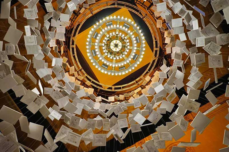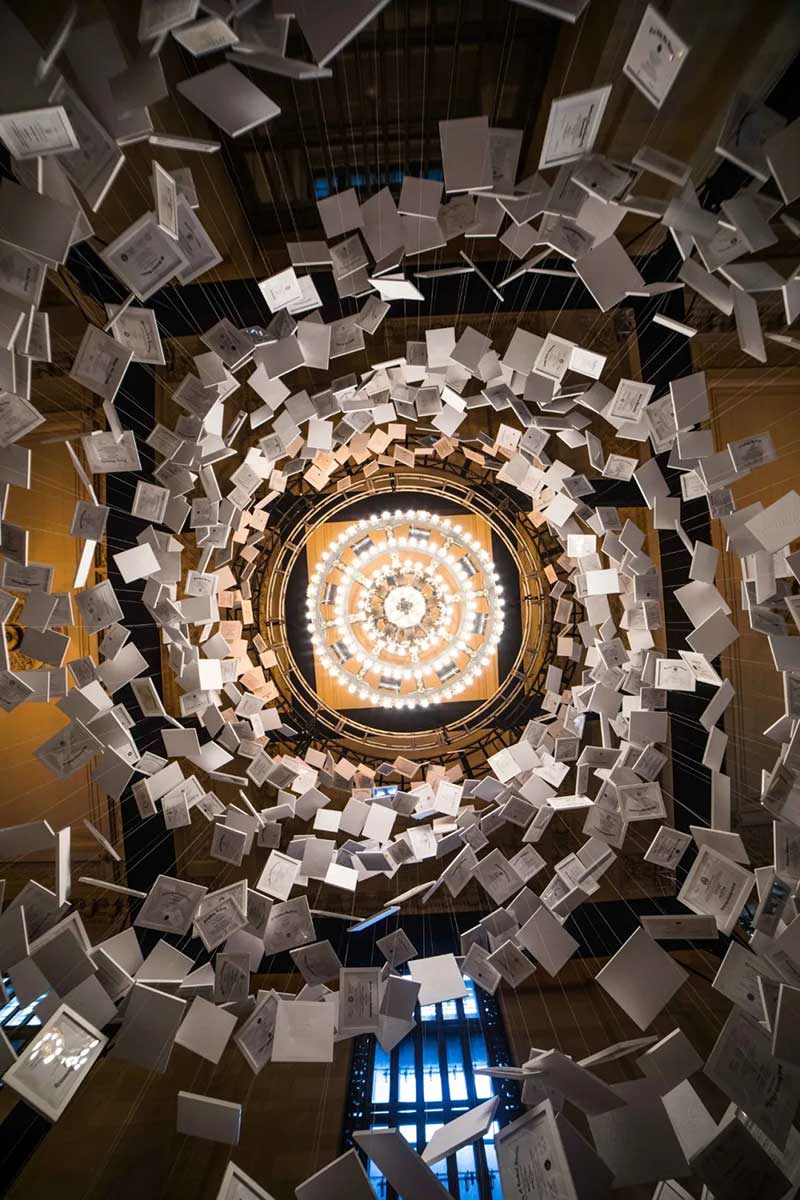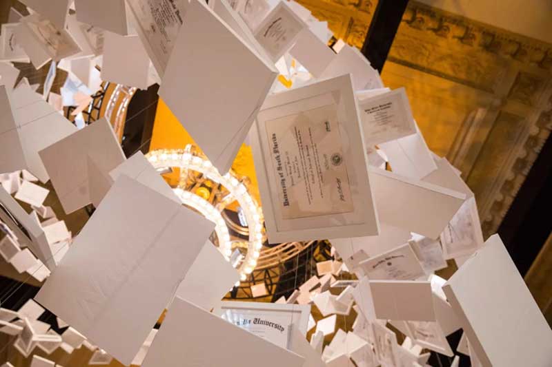百威旗下的啤酒品牌Natural Light在纽约中央火车站放置了一个崭新的艺术装置,为大家带来了更加新鲜的体验。这个艺术装置很有意思的是由2600 份大学文凭组成,挂在中空的车站大堂,按美国平均学费来算,这个艺术展览价值4.7亿美元,仰头都是金钱!