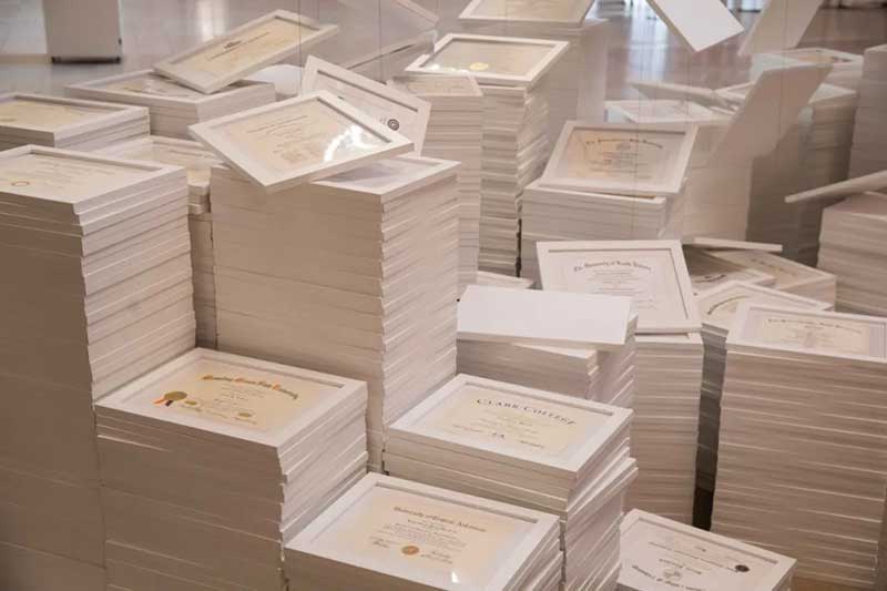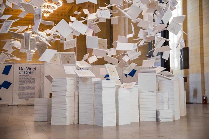 这个由Natural Light Beer sponsor策展的装置艺术,名为达芬奇的债务(Da Vinci of Debt),是要凸显现在美国有超过四亿七千万美金的大学学费贷款的债务问题,每一张大学毕业证书就象征一笔等待还清的债务。Natural Light拥有为期10年的学生贷款计划:每年都会为负债的大学生提供总价100万美元的债务减免。作品的概念是一阵狂风将放在地上的各个大学的毕业证书吹起,漫天的债务,还不完,理还乱。