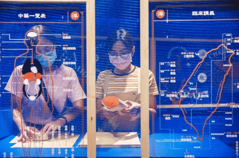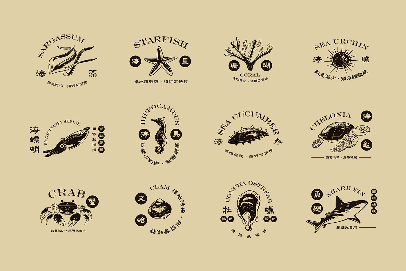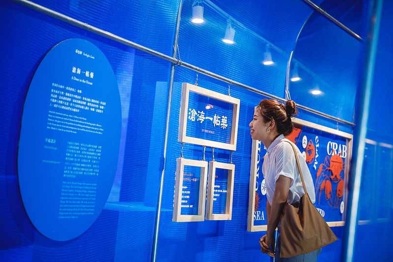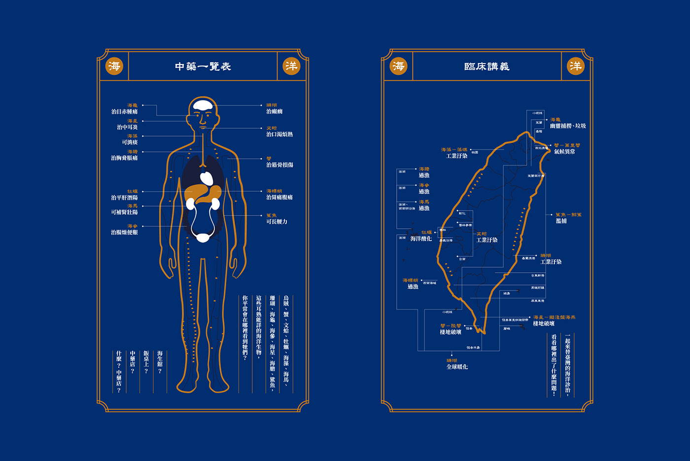 寄身於山海中,成為滄海之一帖藥。 很多海洋生物,都被當作中藥食材,拿來治療人類的疾病或作為食補,也因此被過度捕撈,漸漸成為了瀕危物種。現在,換作我們成為治療滄海的一帖藥,雖然一個人的力量可能渺小到微不足道,但累積很多人的力量,或許可以換成我們來治癒海洋。因著這個概念,我們製作了四個展區-【觀滄海】、【識滄海】、【抓帖藥】、【服帖藥】,帶大家看看認識滄海一帖藥,思考如何成為滄海的一帖藥。