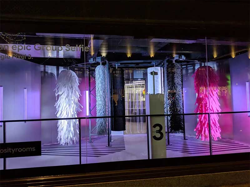 洛杉矶艺术家达雷尔·凯里精心打造的Instagram抽象房间。达雷尔仅使用胶带,就创造了一种令人难以忘怀的杰作,以改变观看者对空间的感知,这为展示Pixel 3的Group Selfie(广角自拍)功能提供了完美的背景。