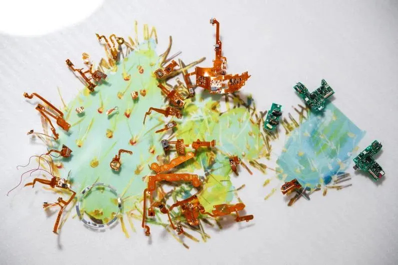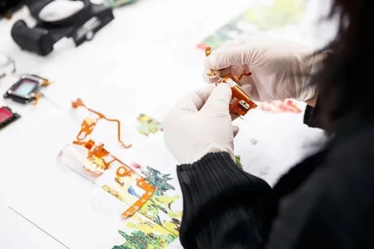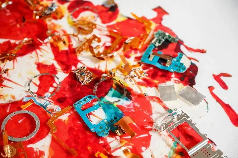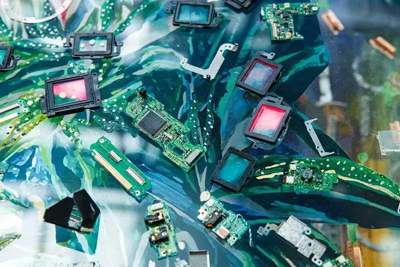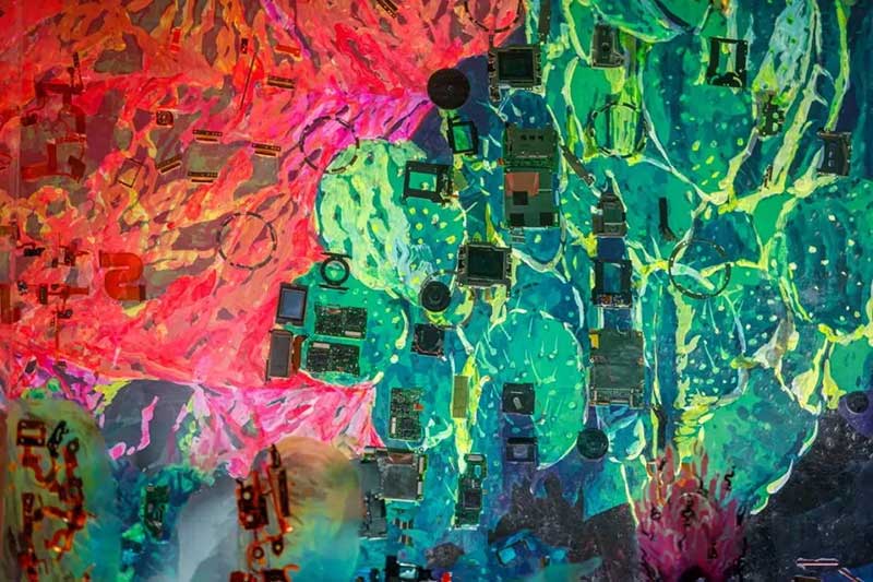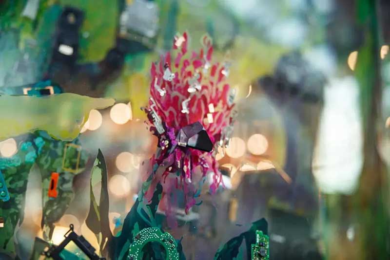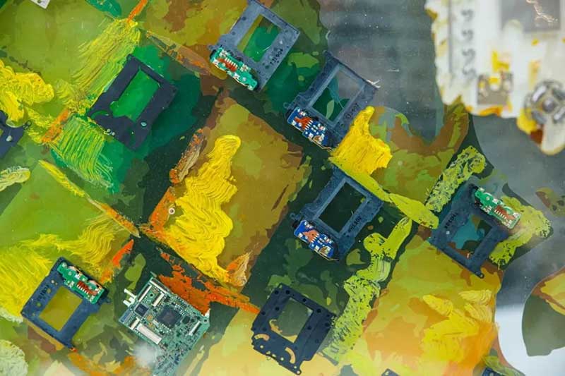 《万物共生》将《小径分岔的花园》原图像分解为近、中、远三个图层,喷印于三层亚克力屏风,作品表面附着了2,021个相机零件。亚克力的透明属性带来晶莹剔透的画面效果,屏风造型又使其百转千回,若隐若现, 让植物、生态和科技有了新的结合方式。在喷印与手绘颜料表面,艺术家将大小不一形态各异的相机零件以拼贴手法融合进画面。图像与色彩,相机零件的不同质感相互叠加、嵌合,带来既丰富又通透的视觉体验感,使驻足的观众作为观看的主体,沉浸于发现和寻美的曼妙体验。整个艺术装置高6000px、长13375px、宽100 cm,历时150天完成。