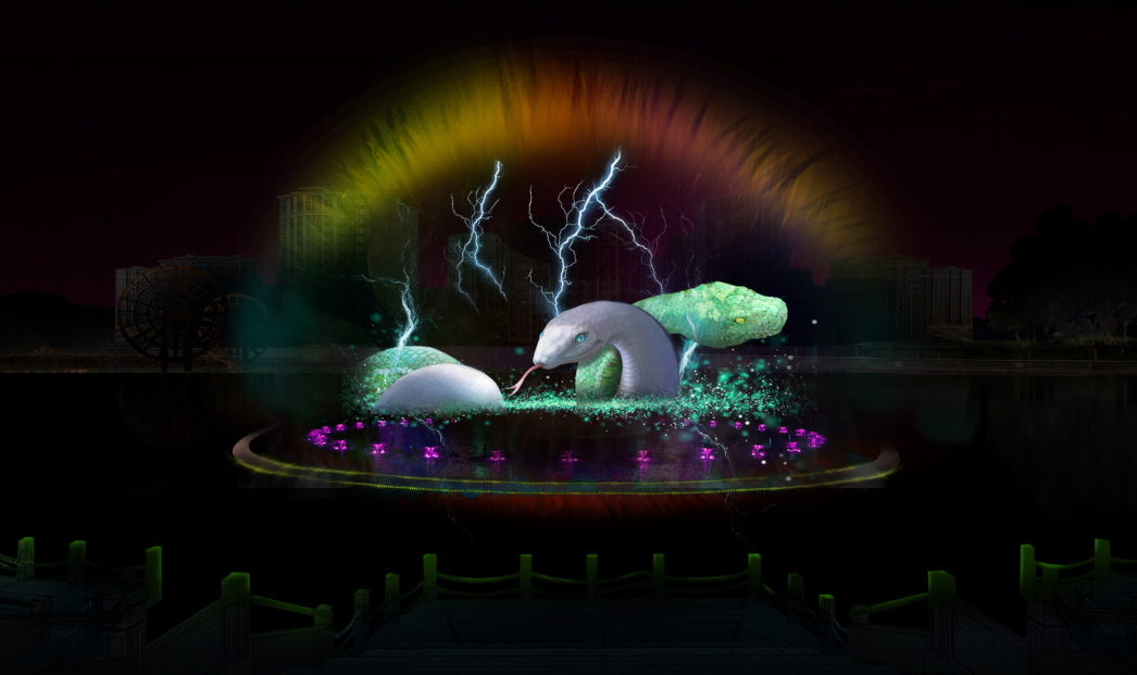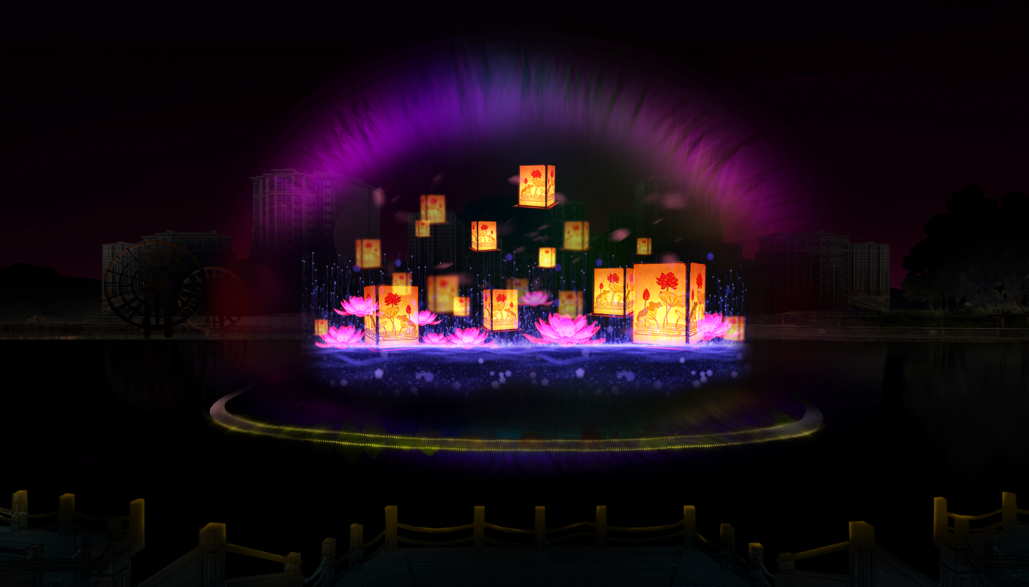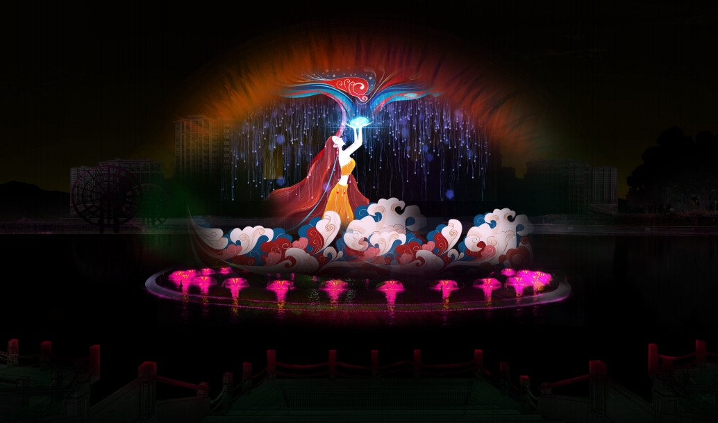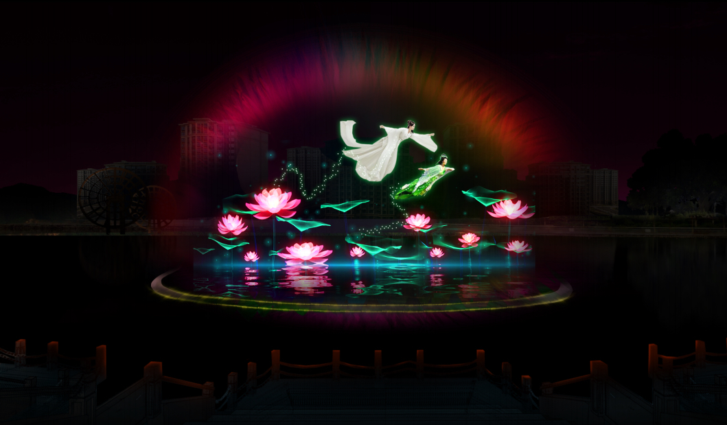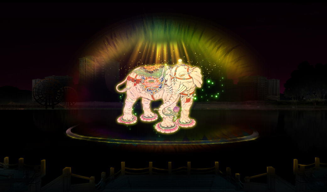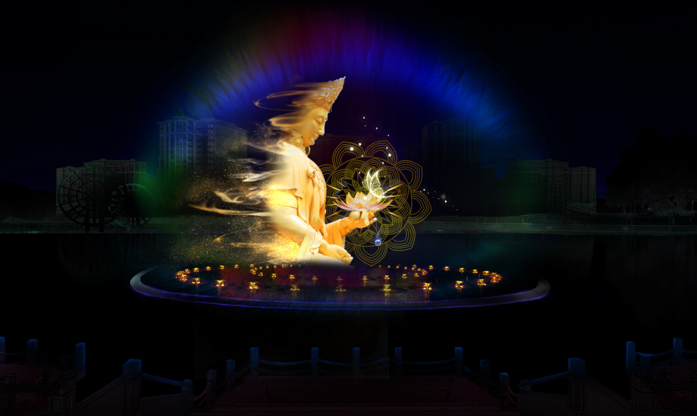 整个光影秀时长为15分钟,共有五个篇章:缘起、众生、莲界、轮回、华彩乐章。其中视觉秀的总时长为9分钟,这就要求每个篇章只有2-3分钟展现时间,要在如此短促的时间内讲述好每个章节的故事实属不易,需要把握好故事架构的每一个细节。
