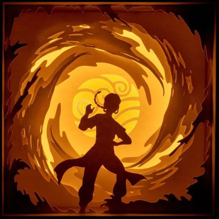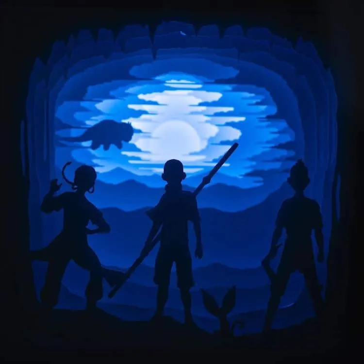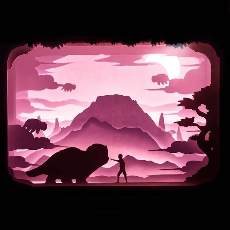 这些灯箱作品以人物和动物的鲜明轮廓为主,背景则衬垫着具有层次感的各种自然元素,而其中讲述的故事则通常是动画与电影电视节目中的经典场景。Ben Charman的创作灵感来源大多为时下流行文化,例如去年电影《降世神通:最后的气宗》非常受欢迎,他便从中取得巨大的灵感,作品也随着电影人气水涨船高。