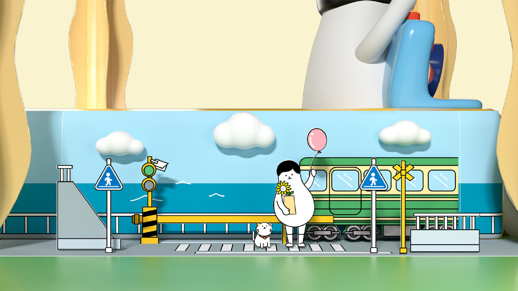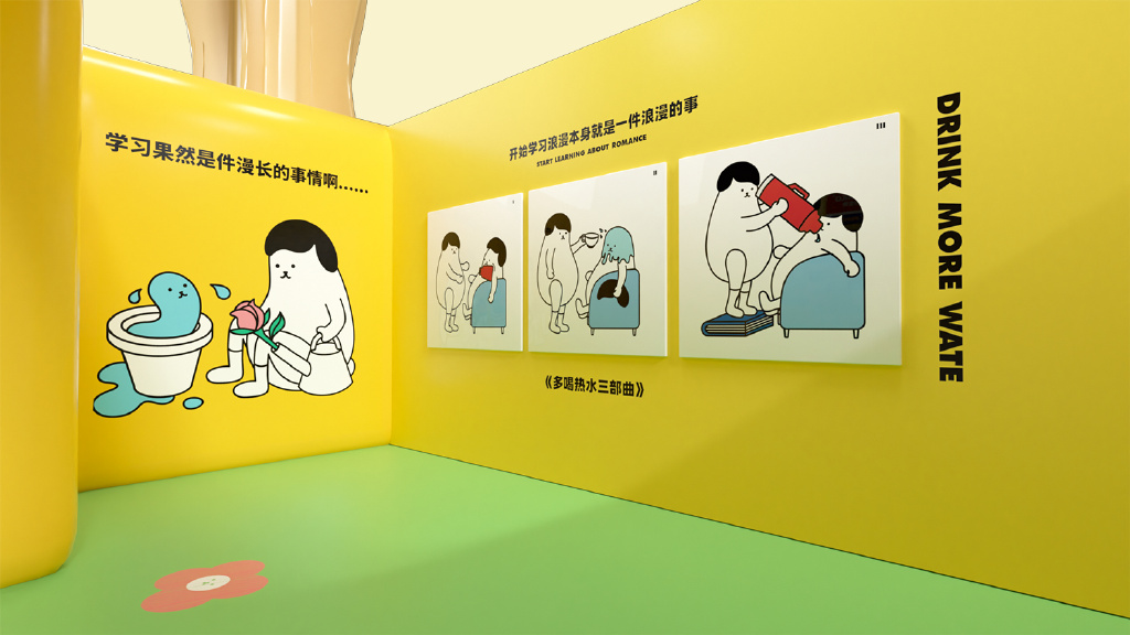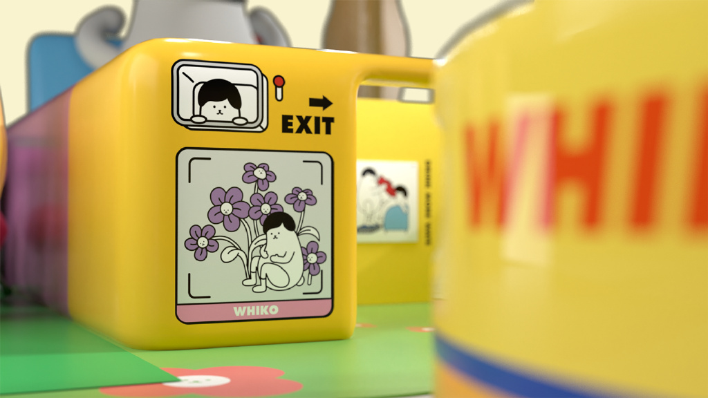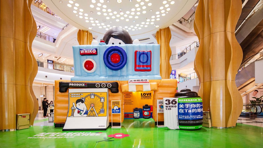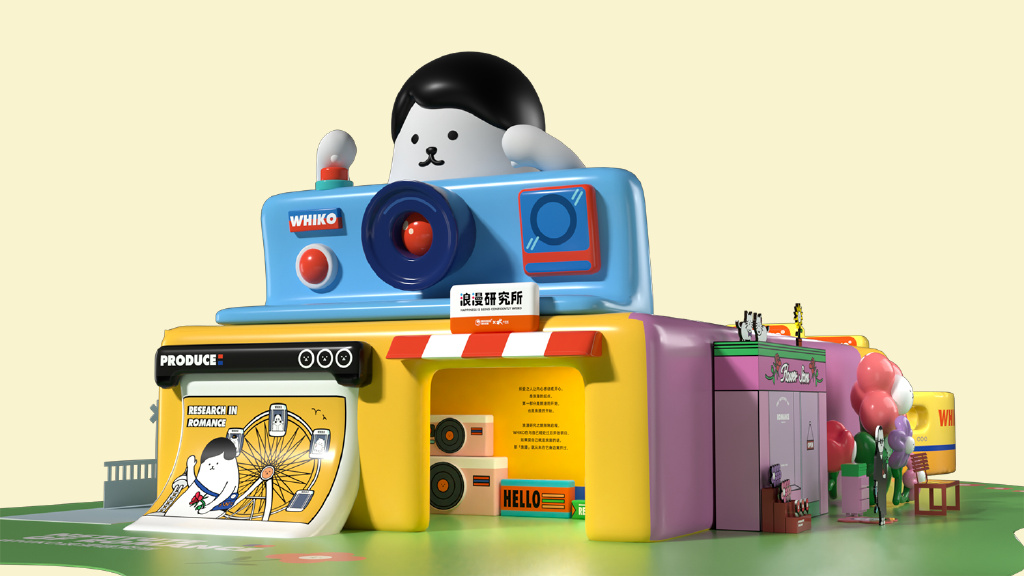 将近6米高的巨大WHIKO手持大型相机出现在静安大悦城,人类穿过相机便进入了WHIKO的「浪漫研究所」当中。展览的主展区由四个部分组成,分别展示WHIKO对浪漫的不同定义,每一个主题区域都通过插画故事绘本的形式展示了WHIKO见证浪漫的点点滴滴。