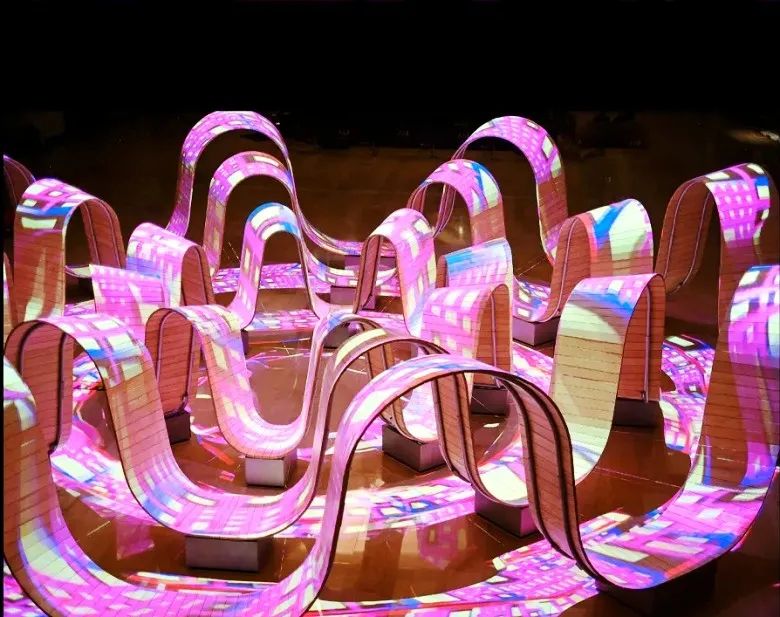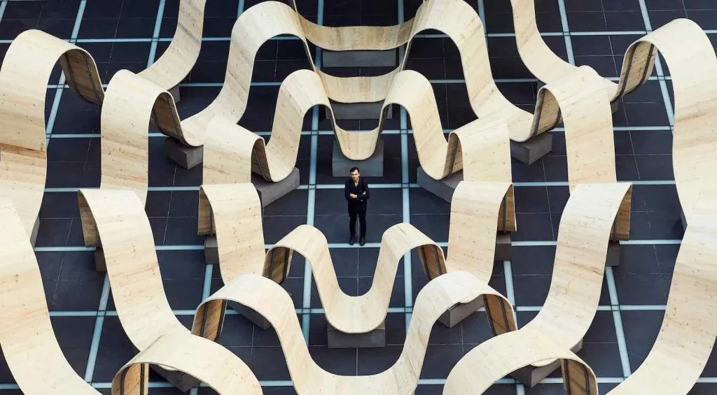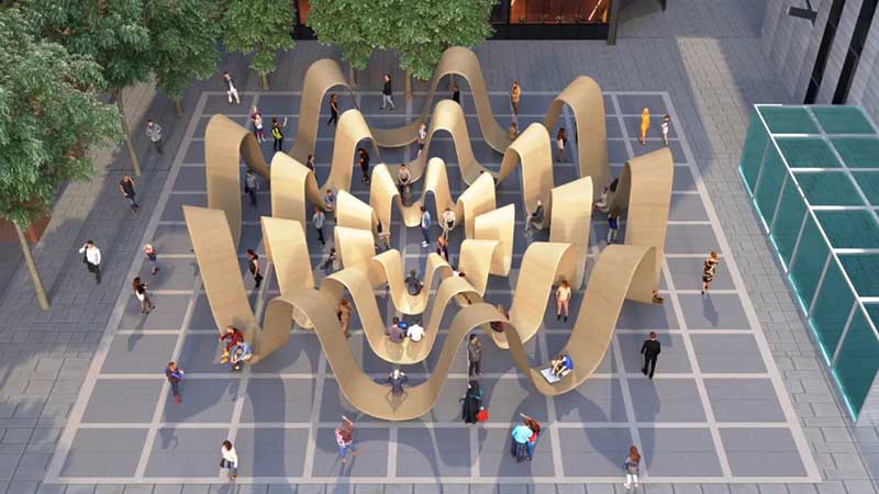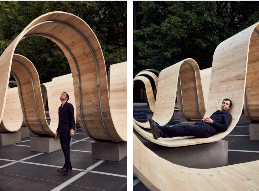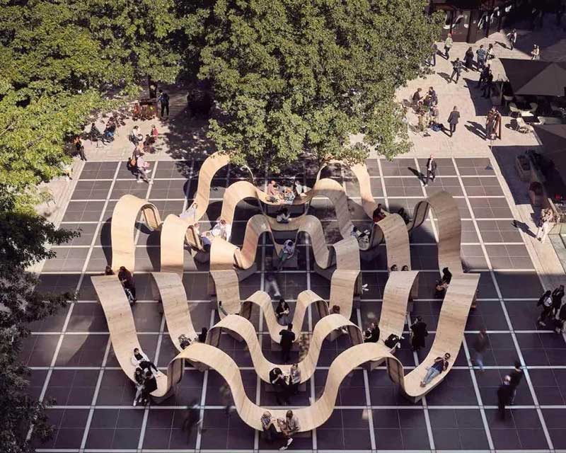 “Please Be Seated 请就座”由英国著名设计师保罗•考克赛兹设计。 「请就座」是对繁忙都市生活的响应,为参观者带来全新的空间和社区互动体验。装置全长15.2米,呈木制大波浪形,拱起的部分可供人们穿梭其中、探索空间乐趣,弯曲的底部则成为人们放松休憩的最佳落脚点。作品由可持续来源的木材制成,彰显对可持续发展的重视。