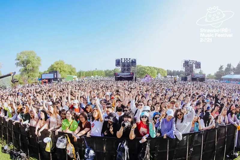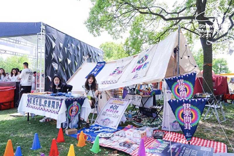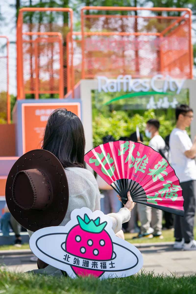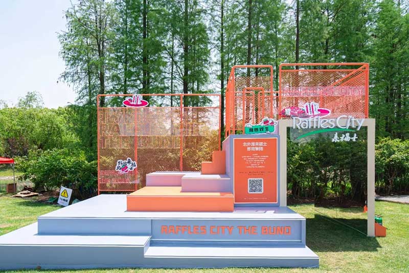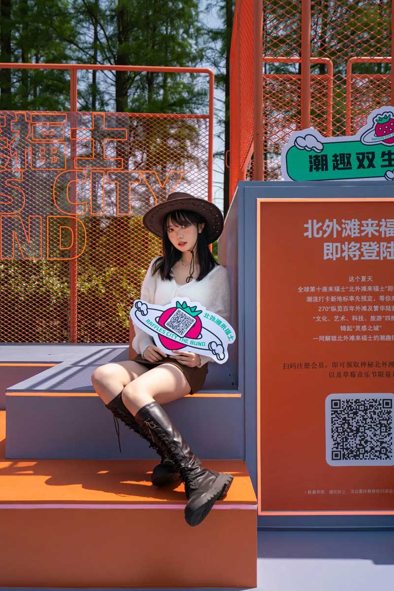 在草莓音乐节现场,除了精彩的表演,来自各品牌争奇斗艳的展台,也很值得一逛。例如从白天火到深夜的北外滩来福士展台,明亮的荧光橙在一众展台里非常吸睛。分为上下两层,用橙色网格围绕,怎么拍都好看的北外滩来福士展台,因为超高的颜值和出片率,一度在现场引来排队拍照的热潮。无论是背靠青葱树林的二层展台,或是巧用台阶拉出大长腿的一楼区域,都是分分钟出大片的“摆拍圣地”。巧用镜子元素拉长视觉空间的“秘密基地”,更是惹来神颜小姐姐们前来打卡。入夜后,亮起橙色LED灯的展台更为炫目。在会发光的台阶上,跟着主舞台的音乐节奏,肆意摇摆身体,感受夜间的徐徐微风和粉丝的浓厚热情,这一届草莓音乐节着实令人难忘。