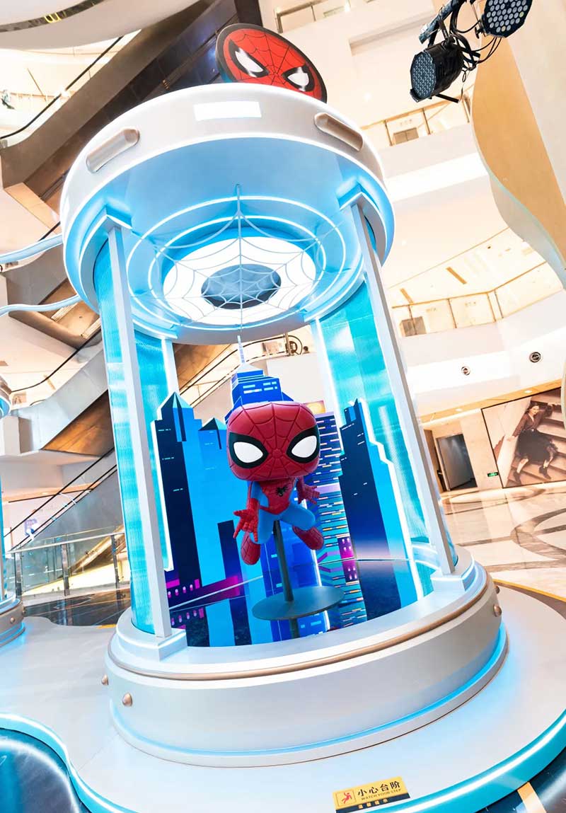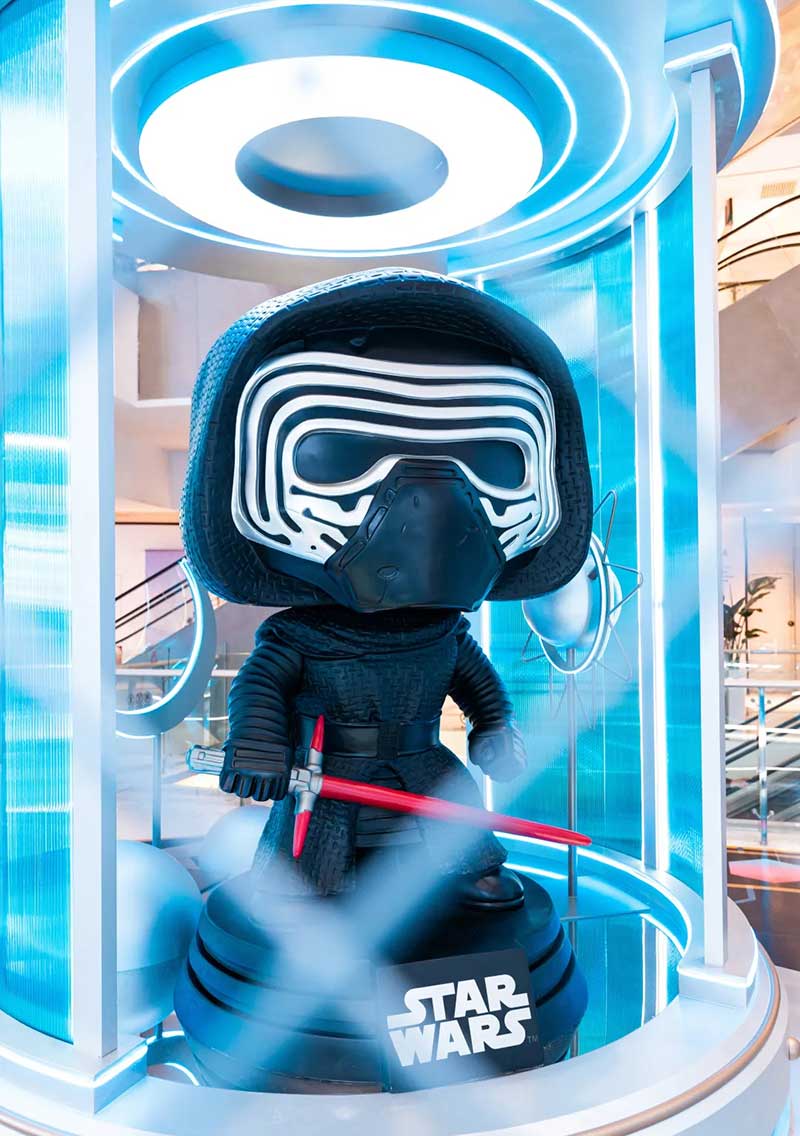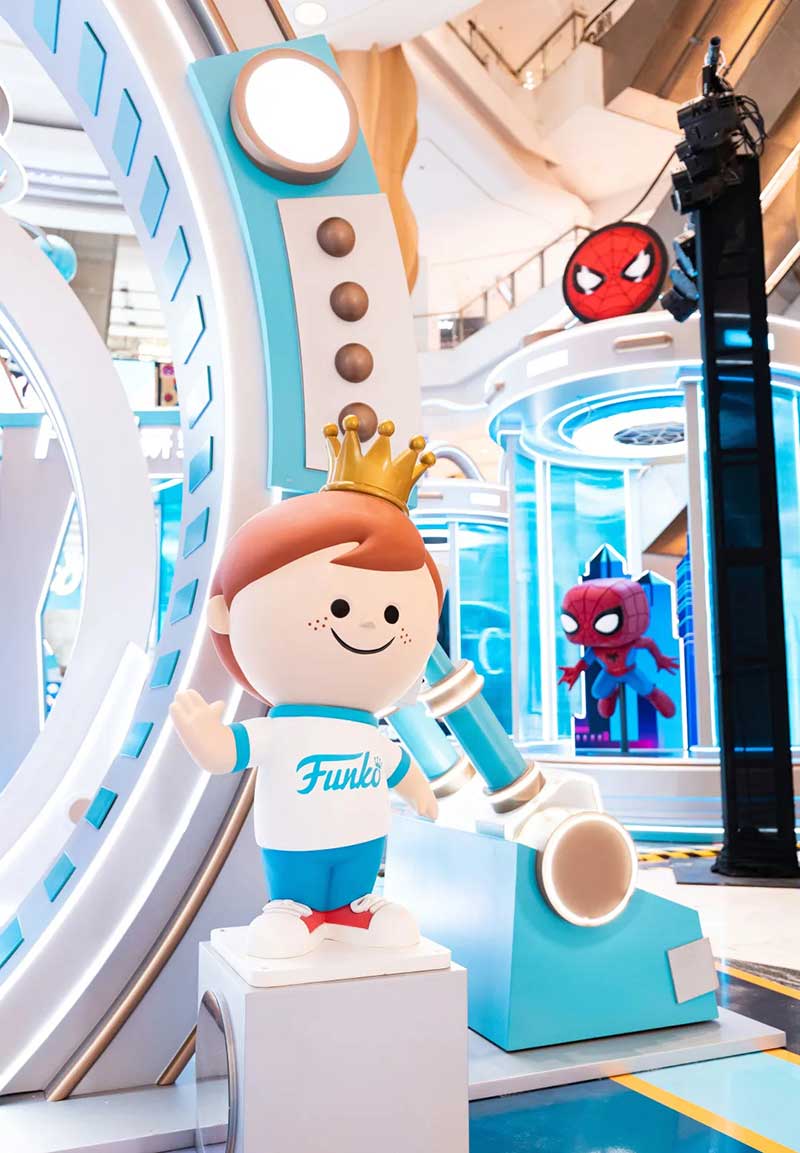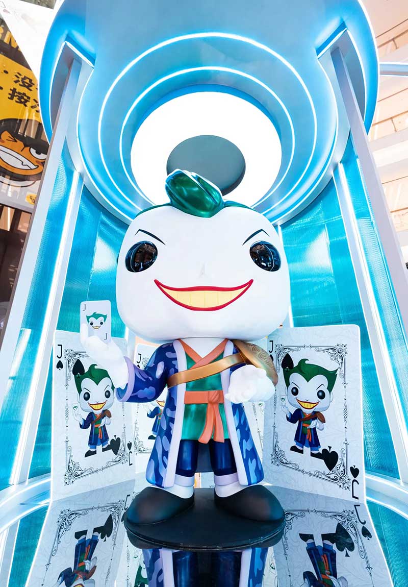 来到位于南座三楼中庭处的『超能FUN研究所』,穿过研究所入口处的异次元传送门,一座3米高的FUNKO蝙蝠侠雕塑抢先映入眼帘,不同以往的铠甲装扮,让这位来自美国的超级英雄多了几丝东方韵味。沿着走廊继续深入,半弧形的展示墙上,整齐陈列着50款FUNKO珍藏版潮玩,奥特曼、毒液、尤达….这里详细记录着FUNKO多年的发展历程。除此之外,研究所周围放置的巨大观察舱内,还藏着多位超能英雄,正等你前来近距离互动。