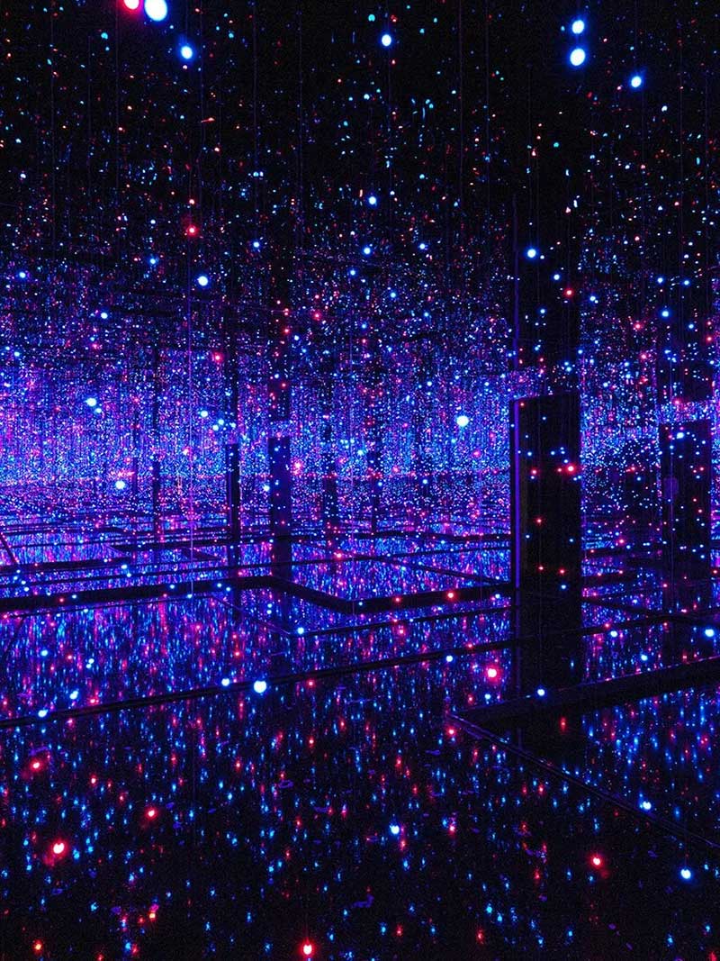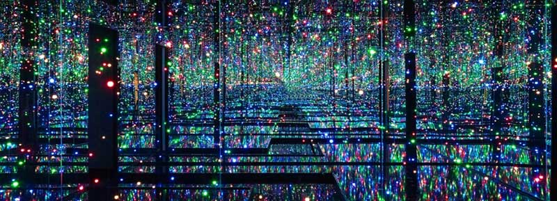 草间弥生的《无限镜屋》系列作品大概有二十件,大部分是利用小灯点缀黑暗的镜像空间中,一方面强调草间弥生的经典圆点,一方面营造出宇宙的空间感,带领观众感受置身于地球之外的感觉,像是《无限镜屋:满载生命灿烂》在镜像空间中装置蓝色、红色、绿色的灯,有如闪烁的银河,令人分不清楚真实与虚幻。