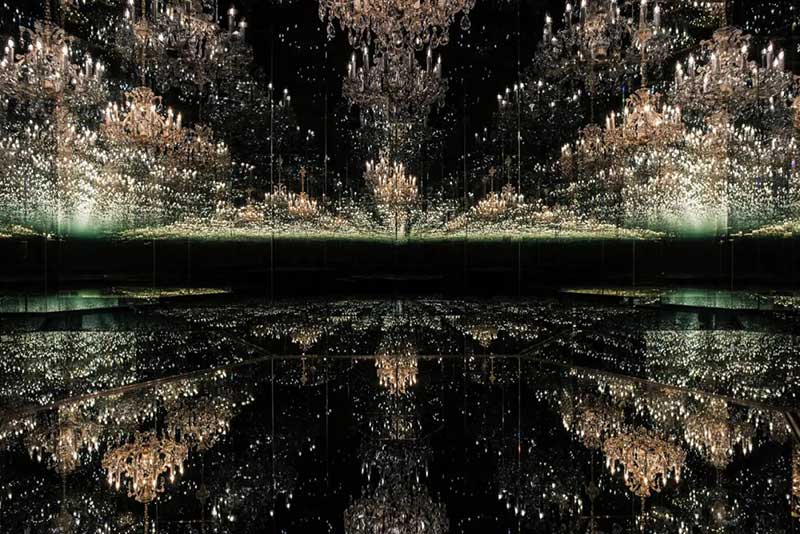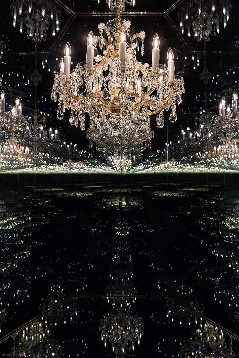 《无限镜屋:悲伤水晶吊灯》则是草间弥生与施华洛世奇合作的作品,在镜室中央装设巴洛克风格的枝型吊灯,由于吊灯位于上方,因而自然引导观众的视线往上,强调出灯光装置本身的存在,随着灯光缓慢旋转,灯光反射在四周的镜面,创造出无限延伸的空间感,尽管少了草间弥生的经典圆点元素,却多了点华丽、奇幻、诡异的氛围,很是特别。