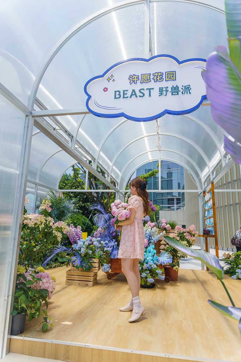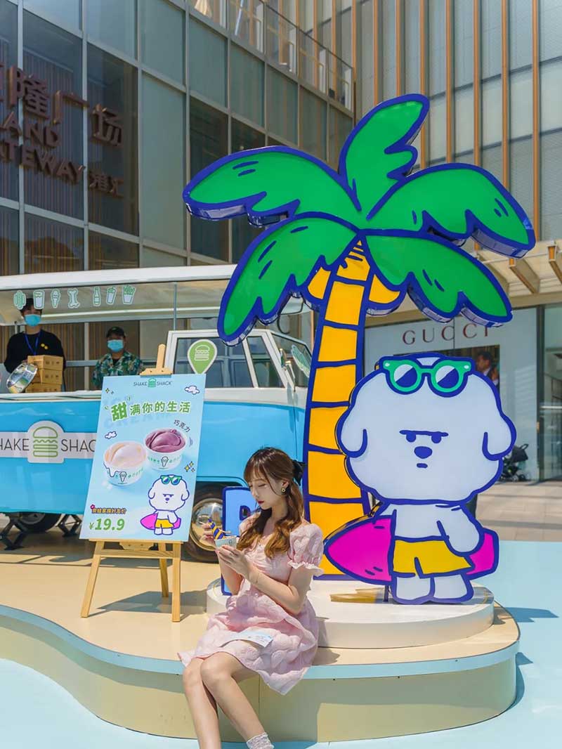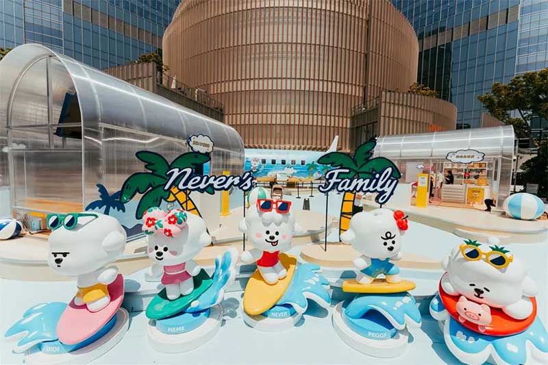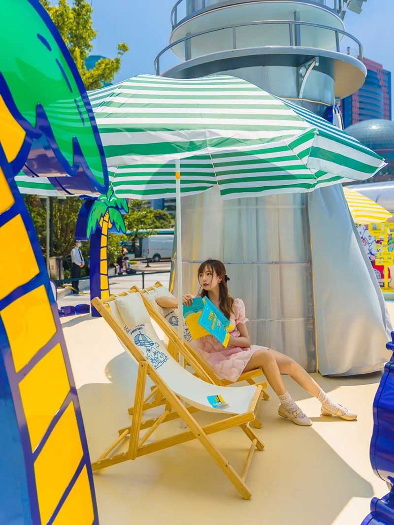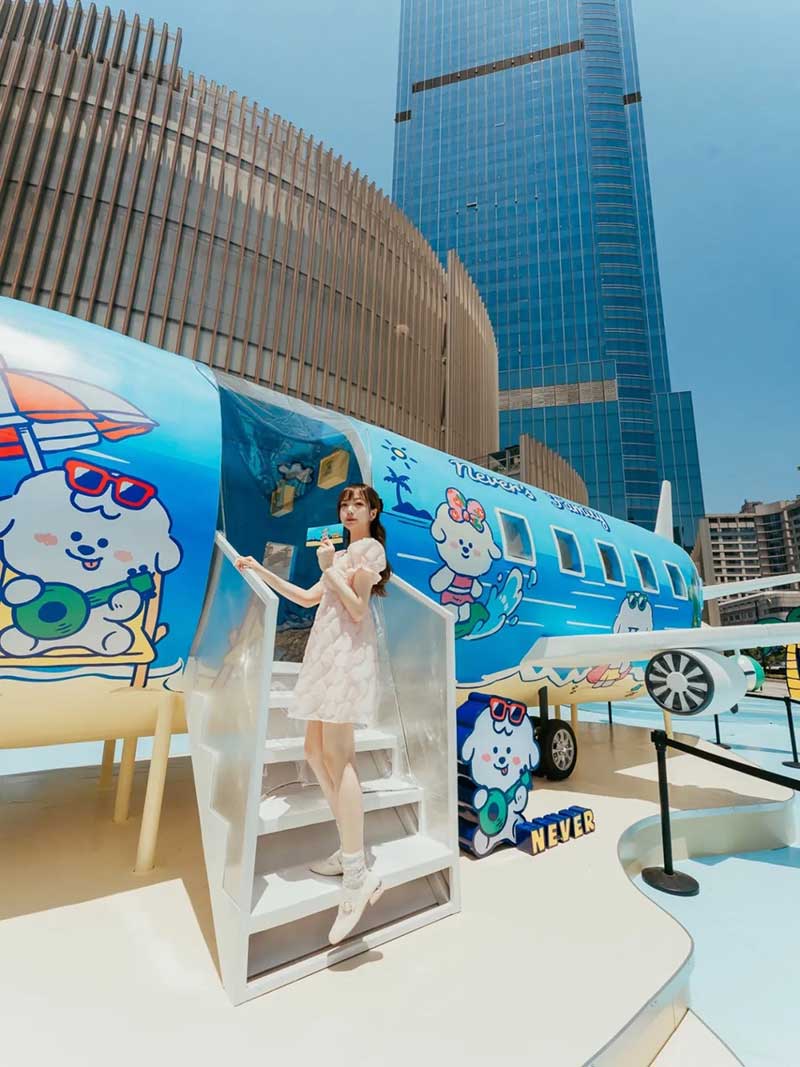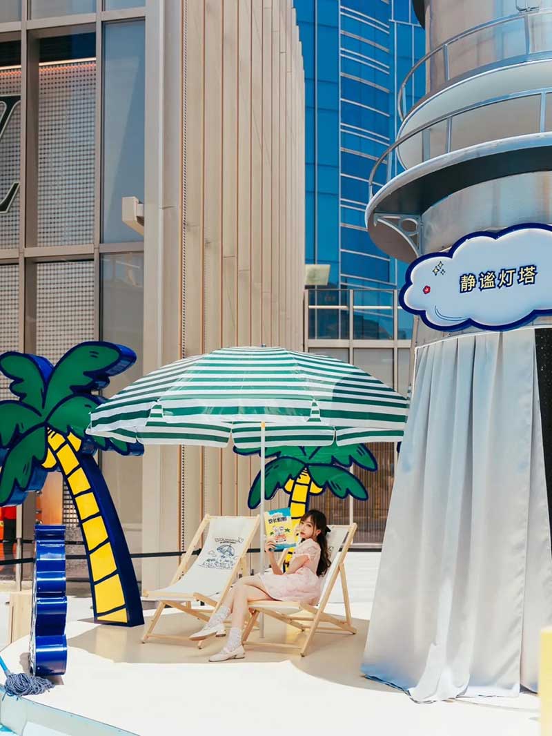 ‘“奈娃家族的悠长假期”的IP全国首展,果然不失所望,处处有惊喜,让我们用第一波体验,带你们先睹为快!在广场正口外,就能看到醒目的“奈娃家族的悠长假期”IP全国首展装置,展览主要有五大打卡点,每一环节都身临其境,好像自己真的开始了一段假期,比如这个蓝色的飞机装置,栩栩如生,很有马上开启旅程的真实感。另一边的奈娃家族IP形象,五个表情形态各不相同,憨态可掬的模样,让人忍不住驻足拍照打卡。有了如此逼真的展览配置,让“奈娃家族的悠长假期”展览游览过程,颇具有仪式感。从在NF航站楼出发,开启接下来的旅程。“落地”后,来到许愿花房,整个花房被鲜花堆满,充盈着悠悠的花香,一踏入花房,阵阵香气就扑面而来。在这里可以留下许愿卡片,并拍照打卡。在现场和大家一起,进行#奈娃家族的悠长假期#话题互动。下一站是夏天必备的甜蜜冰车,SHAKE SHACK的冰淇淋味道浓郁、蛋筒酥脆,还有什么比夏日里的冰淇淋,更冰爽甜蜜的呢。吃完冰淇淋,再抵达静谧灯塔,四周围绕着椰子树、沙滩椅,感觉像在海岛,可以拍出假装在海岛的照片。而进入到静谧灯塔里面,布满霓虹灯,让里面充满梦幻迷人的海岛风情,氛围感十足。最后一站是纪念品商店,能现场体验到,提前曝光的奈娃家族联名限量纪念品,比如三明治机、T恤、精美扇子等。